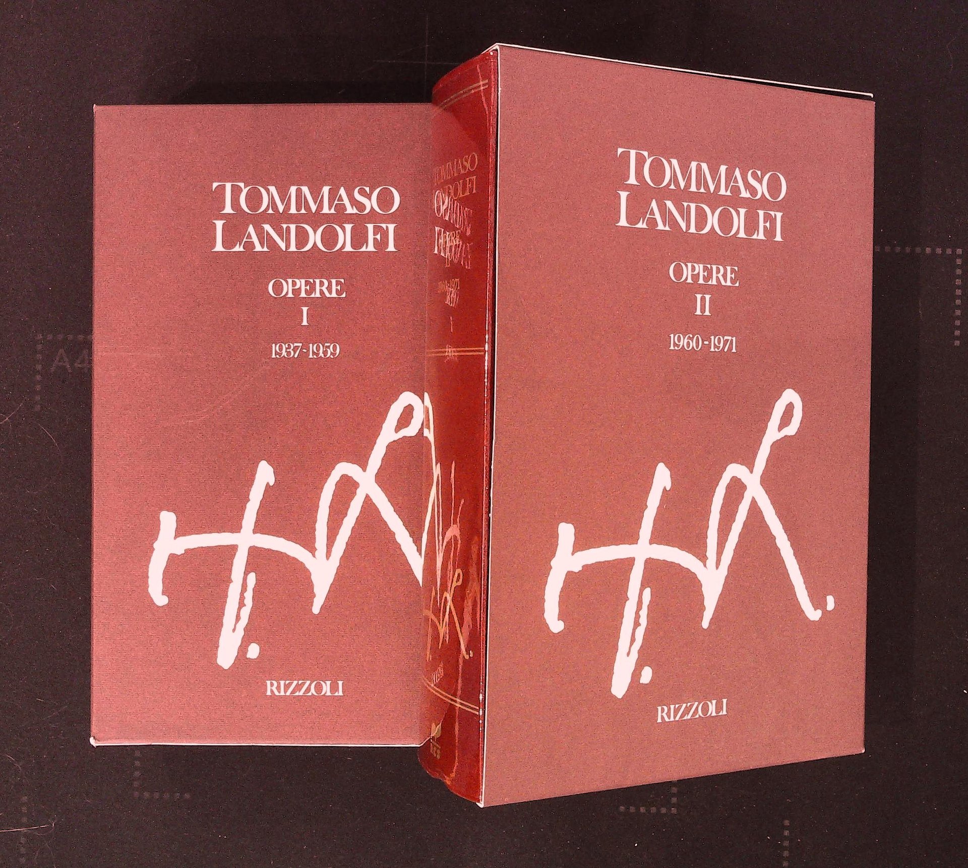 in 8° grande, leg. ed. con dorsi verniciati, taglio alto rosa e acetato in astuccio morbido illustrato, Volume I Opere 1937-1959 pp. LXV - 1047 / Volume II Opere 1960-1971 pp. XVII - 1306 coll. Classici Contemporanei Rizzoli Prefazione di Carlo Bo al primo volume. A cura di Idolina Landolfi. Come nuovi (exp)