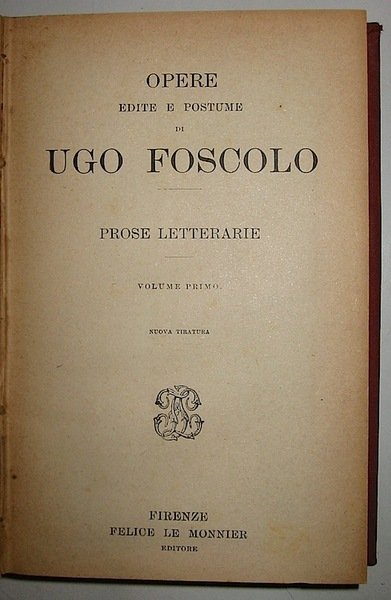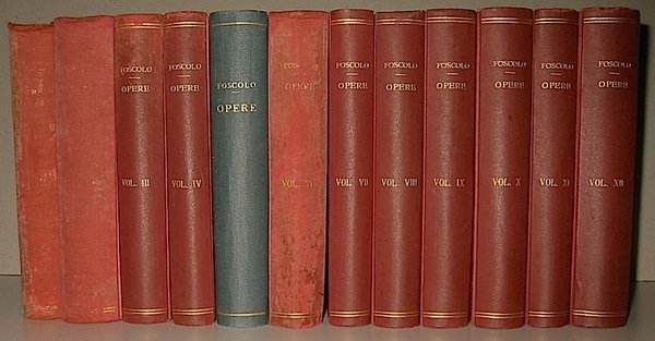 16mo (cm. 17,6), 12 Voll.: Prose letterarie (4 Voll.), Prose politiche (1 Vol.), Epistolario (3 Voll.), Poesie (1 Vol.), Saggi di critica storico-letteraria (2 Vol.), Appendice (1 Vol.). Legature coeve in piena tela rossa con fili e titoli oro al ds. Legature di tre volumi con tracce di sofferta umidità (scoloritura e lieve increspatura). Un volume è in tela verde. Nel complesso, buon esemplare.