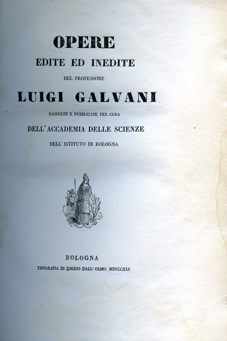 In-4º grande (315x235mm), pp. (4), 120; 505, (3), con ritratto del Galvani inciso in rame da Marchi su disegno di Spagnoli, facsimile di una lettera dell'autore, 9 tavvole f.t. di cui 4 ripiegate. Bella legatura novecentesca in m. marocchino e angoli con dorso a nervi adorno di titolo in oro; conservata la brossura editoriale. Fresco esemplare in barbe e a pieni margini. Prima edizione collettiva, curata da Silvestro Gherardi, delle opere di Galvani (1737-1798), con una biografia dellAutore. L'edizione raccoglie le classiche opere galvaniane sullelettricità animale (tra cui la prima edizione critica del De viribus electricitatis) ed alcune memorie anatomiche mai pubblicate in precedenza, oppure apparse nei volumi dei Commentari dellIstituto delle Scienze. Il Gherardi, che insegnò fisica a Bologna tra il 1827 e il 1848, ebbe accesso ai manoscritti originali del Galvani conservati presso la biblioteca dellAccademia delle Scienze. Tra gli scritti inediti, che testimoniano quanto il Galvani fu attivo anche nel campo dellanatomia e della fisiologia, ricordiamo: De ossibus; De renibus et ureteribus volatilium; De volatilium aure; De Manzoliniana suppelectili; Disquisitiones anatomicae circa membranam pituitariam. F. Ronalds, Catalogue of books and papers relating to electricity, magnetism, etc. including the Ronalds Library, London, 1880, p. 191. Wheeler Gift, 999. F. Rossetti-G. Cantoni, Bibliografia italiana di elettricità e magnetismo, Padova, 1881, p. 45.