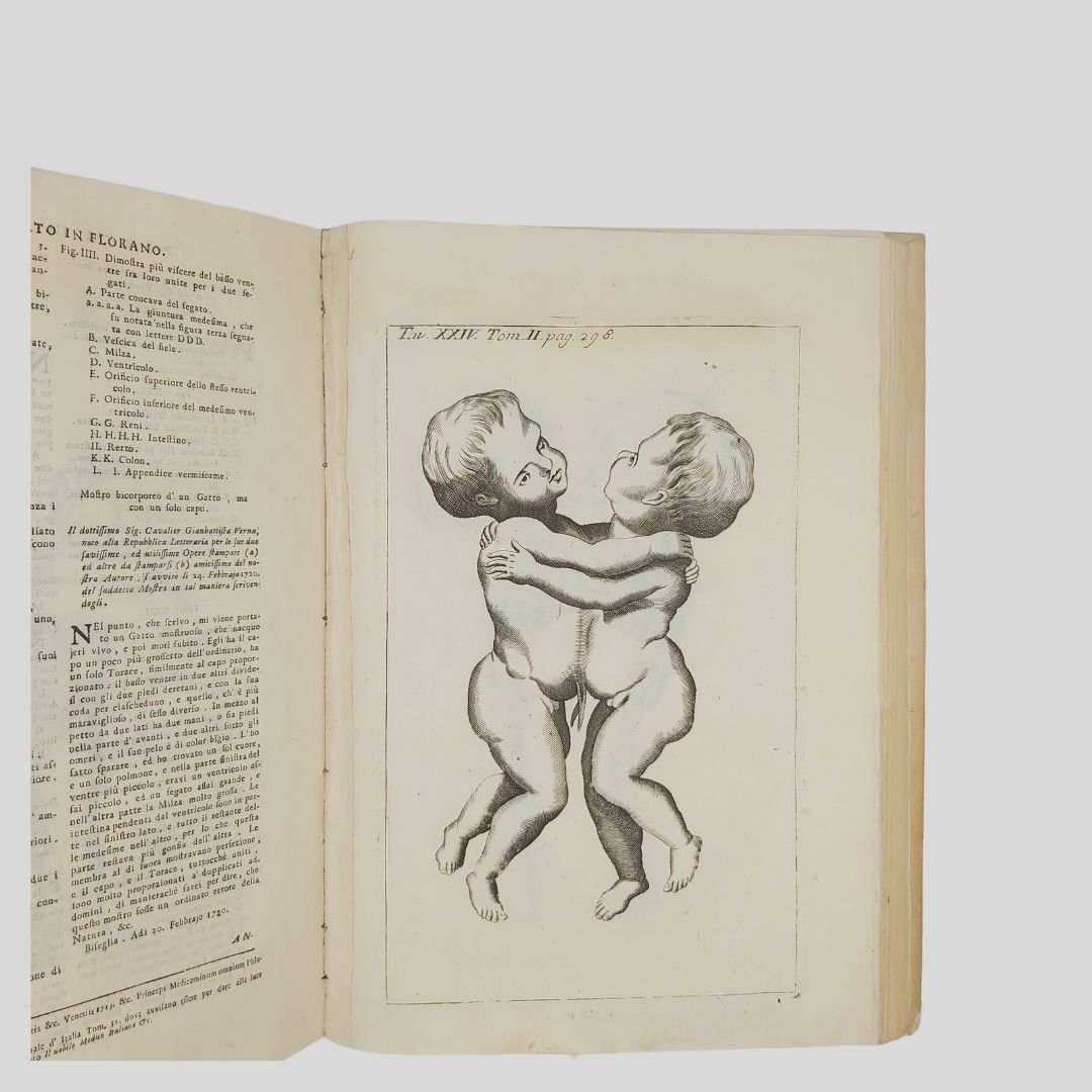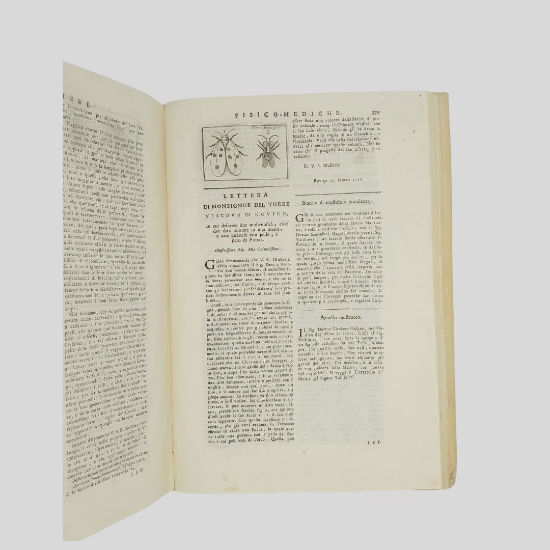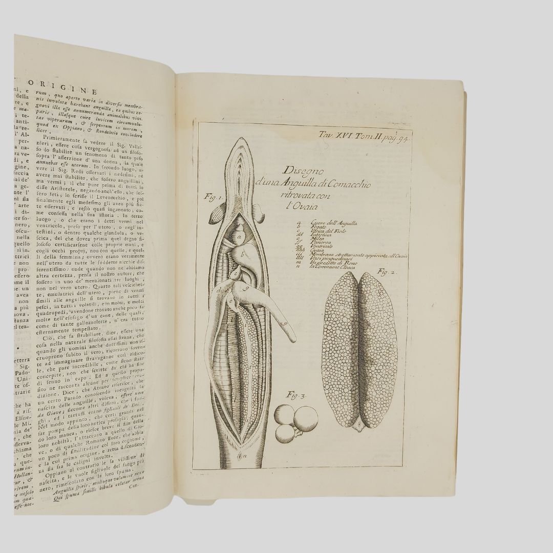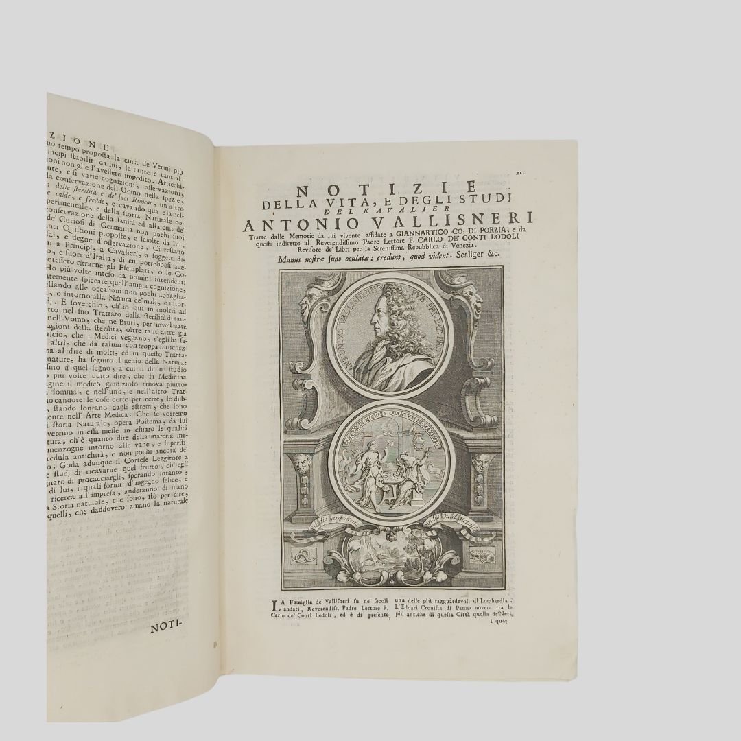 3 voll. in-folio (cm. 35), pp. LXXXII, 469 [i.e. 471]-(1), ripetute nella numerazione le pp. 82-83; (2)-551-(1); (2)-676. Front. del vol. I stampato in caratteri rosso e nero, i tre frontespizi recano vignetta calcogr. Minerva e Mercurio, incisa da Alessandro Dalla Via. Numeroso i capolettera figg. Con 95 tavv., alcune posposte, 2 ritratti inc. in rame e 3 figg. interc. incise in rame e 1 fig. inc. in legno. Piccoli restauri al margine bianco dei frontespizi, e alla tav. XXIV al II vol. Testo ad ampi margini su una e due colonne, in italiano e in latino, note marginali in corsivo a stampa sui margini esterni. Leg. p. perg. tass. e tit. oro ai dorsi con insignific. buchetti (vecchi passaggi di tarme), menda alla cuffia inferiore del vol. III, tagli spruzzati in giallo. Al vol. I lieve fenditura, al vol. II, tracce di antico restauro alle sguardie libere, al vol. III piega morta in fine. L’opera si presenta in freschissime condizioni di conservazione e carta frusciante. Rara edizione originale. Collazione. Vol I: 1 tav. inc. in rame n.t. (ritr. del V. e medaglione allegorico) + 52 tavv. incise in rame (1 ripieg.), per lo più a p. pagina in 43 fogli f.t. + 1 figg. inc. in rame n.t. ( insetti, alghe, rane, camaleonti, sezioni del cervello del bue, piante) + 1 fig. interc. Vol. II: 36 tavv. inc. in rame di cui 35 f.t. (2 ripieg.) e 1 a p. pagina n.t. (mostri umani e marini, crostacei, pesci, anguille…)+ 1 tav. n.t. incisa in rame da Marco Antonio Dal Re, (ritr. di Clelia Grillo Borromeo) + 1 fig. interc. inc. in rame (Isola di Zante). Vol. III: 4 tavv. inc. in rame f.t.+ 1 fig. inc. in legno n.t.+ 3 tavv. inc. in rame n.t. Tra gli argomenti si segnalano: Osservazioni sulle mostruosità (“bicorporei”, senza capo, senza cuore, rana mostruosa, vitelli, sirene etc.), Mutazioni della terra (mutazioni del mare, diluvi, luoghi del mare sommersi), uso dell’aloe e della mandragora… Edizione originale dell’opera omnia del Vallisneri, raccolta e pubblicata dal figlio Antonio tre anni dopo la morte del padre. Contiene tutte le opere edite e inedite. “…Paolo Sangiorgio, nel suo Elogio di Cestoni, sostiene che il compilatore delle Opere […] di Vallisneri non fu il figlio Antonio junior, come è scritto nei frontespizi dei tomi, ma l’ex gesuita Saverio Quadrio. La notizia fu data, secondo Sangiorgio, dallo stesso Quadrio al padre di Paolo Sangiorgio, Giannambrogio…”. Esistono tre diverse emissioni delle “Opere fisico-mediche”, edite dal Coleti nel 1733, il ns. esemplare appartiene alla seconda emissione. Cfr. Sabia, n. 233; Gamba, II, p. 601; Graesse, VI p.II, p.252; SBN: IT\ICCU\UFIE\003000. «Antonio Vallisneri fu il principale esponente della tradizione medica e naturalistica galileiana tra Sei e Settecento. I suoi interessi spaziarono dalla medicina all’anatomia comparata, dall’entomologia e dall’etologia degli insetti alla loro sistematica, dalle scienze della Terra all’embriologia, dalle scienze naturali alla lessicografia. A un’attività intensissima di studio e di ricerca legò uno sforzo imponente di diffusione della scienza sperimentale, attraverso un carteggio monumentale e il giornalismo erudito, che gli consentirono di esercitare in Italia una sorta di egemonia culturale nelle scienze mediche, naturalistiche e della vita nei primi trent’anni del Settecento». [Dario Generali]. Professore nell’Ateneo di Padova fu tra i primi a fare impiego sistematico del microscopio nelle sue ricerche. Importanti sono anche i suoi studi nel campo della paleontologia e della geologia.