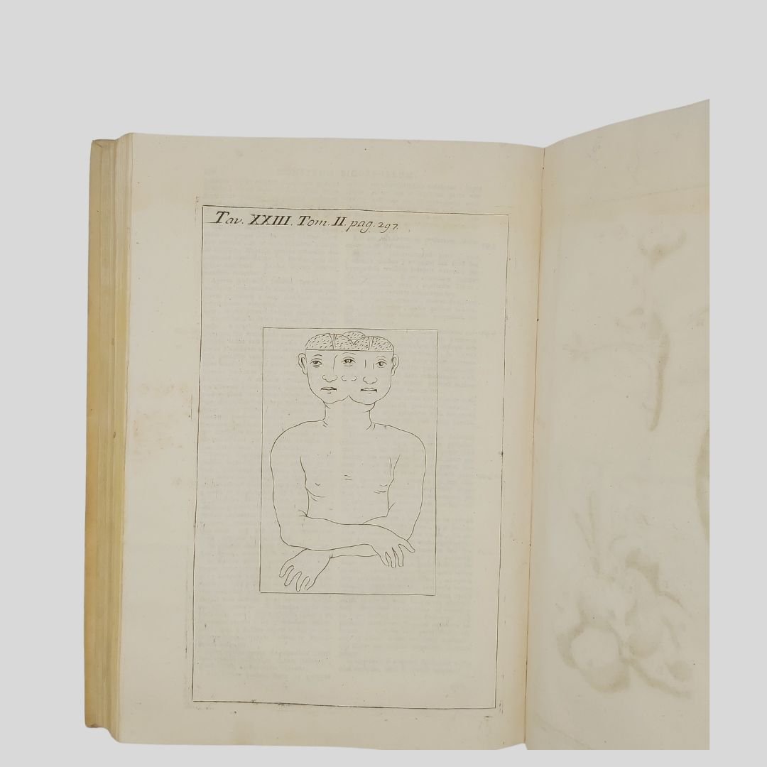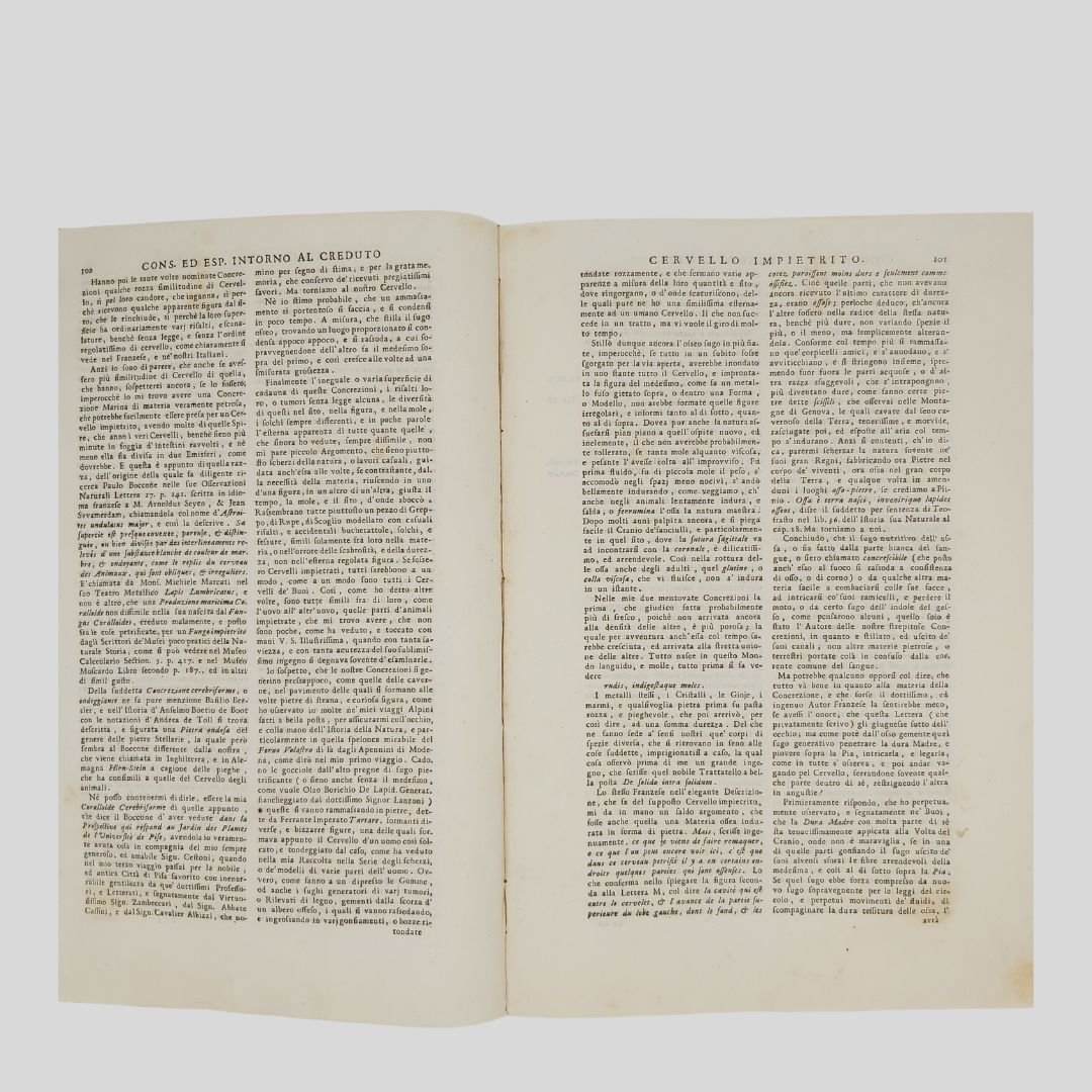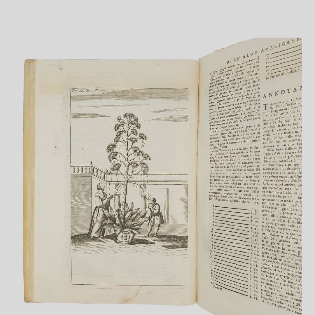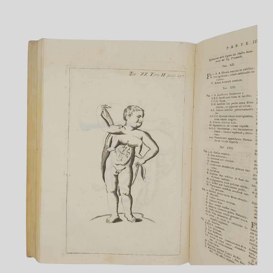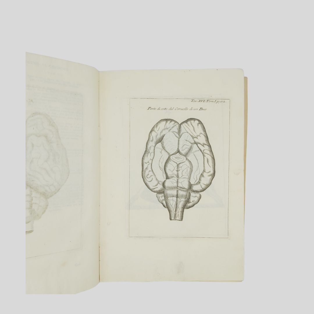 3 voll. in-folio (cm. 35), pp. LXXXII, 469 [i.e. 471]-(1), ripetute nella numerazione le pp. 82-83; (2)-551-(1); (2)-676. Front. del vol. I stampato in caratteri rosso e nero, i tre frontespizi recano vignetta calcogr. Minerva e Mercurio, incisa da Alessandro Dalla Via. Numeroso i capolettera figg. Con 95 tavv., alcune posposte, 2 ritratti inc. in rame e 3 figg. interc. incise in rame e 1 fig. inc. in legno. Piccoli restauri al margine bianco dei frontespizi, e alla tav. XXIV al II vol. Testo ad ampi margini su una e due colonne, in italiano e in latino, note marginali in corsivo a stampa sui margini esterni. Leg. p. perg. tass. e tit. oro ai dorsi con insignific. buchetti (vecchi passaggi di tarme), menda alla cuffia inferiore del vol. III, tagli spruzzati in giallo. Al vol. I lieve fenditura, al vol. II, tracce di antico restauro alle sguardie libere, al vol. III piega morta in fine. L’opera si presenta in freschissime condizioni di conservazione e carta frusciante. Rara edizione originale. Collazione. Vol I: 1 tav. inc. in rame n.t. (ritr. del V. e medaglione allegorico) + 52 tavv. incise in rame (1 ripieg.), per lo più a p. pagina in 43 fogli f.t. + 1 figg. inc. in rame n.t. ( insetti, alghe, rane, camaleonti, sezioni del cervello del bue, piante) + 1 fig. interc. Vol. II: 36 tavv. inc. in rame di cui 35 f.t. (2 ripieg.) e 1 a p. pagina n.t. (mostri umani e marini, crostacei, pesci, anguille…)+ 1 tav. n.t. incisa in rame da Marco Antonio Dal Re, (ritr. di Clelia Grillo Borromeo) + 1 fig. interc. inc. in rame (Isola di Zante). Vol. III: 4 tavv. inc. in rame f.t.+ 1 fig. inc. in legno n.t.+ 3 tavv. inc. in rame n.t. Tra gli argomenti si segnalano: Osservazioni sulle mostruosità (“bicorporei”, senza capo, senza cuore, rana mostruosa, vitelli, sirene etc.), Mutazioni della terra (mutazioni del mare, diluvi, luoghi del mare sommersi), uso dell’aloe e della mandragora… Edizione originale dell’opera omnia del Vallisneri, raccolta e pubblicata dal figlio Antonio tre anni dopo la morte del padre. Contiene tutte le opere edite e inedite. “…Paolo Sangiorgio, nel suo Elogio di Cestoni, sostiene che il compilatore delle Opere […] di Vallisneri non fu il figlio Antonio junior, come è scritto nei frontespizi dei tomi, ma l’ex gesuita Saverio Quadrio. La notizia fu data, secondo Sangiorgio, dallo stesso Quadrio al padre di Paolo Sangiorgio, Giannambrogio…”. Esistono tre diverse emissioni delle “Opere fisico-mediche”, edite dal Coleti nel 1733, il ns. esemplare appartiene alla seconda emissione. Cfr. Sabia, n. 233; Gamba, II, p. 601; Graesse, VI p.II, p.252; SBN: IT\ICCU\UFIE\003000. «Antonio Vallisneri fu il principale esponente della tradizione medica e naturalistica galileiana tra Sei e Settecento. I suoi interessi spaziarono dalla medicina all’anatomia comparata, dall’entomologia e dall’etologia degli insetti alla loro sistematica, dalle scienze della Terra all’embriologia, dalle scienze naturali alla lessicografia. A un’attività intensissima di studio e di ricerca legò uno sforzo imponente di diffusione della scienza sperimentale, attraverso un carteggio monumentale e il giornalismo erudito, che gli consentirono di esercitare in Italia una sorta di egemonia culturale nelle scienze mediche, naturalistiche e della vita nei primi trent’anni del Settecento». [Dario Generali]. Professore nell’Ateneo di Padova fu tra i primi a fare impiego sistematico del microscopio nelle sue ricerche. Importanti sono anche i suoi studi nel campo della paleontologia e della geologia.