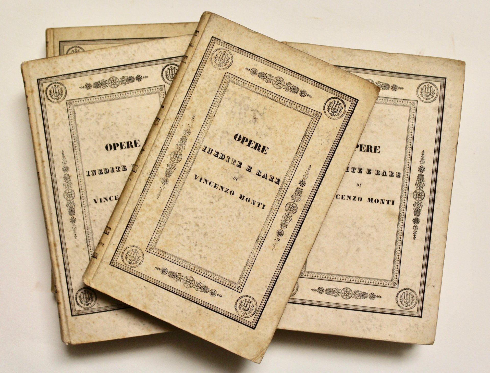 5 volumi in 8°(mm 230x150); pagg. (4), ritratto di busto del Monti, opera di P. Marchesi, inciso da Carlo Maria Borde su disegno di Napoleone Melini, pagg. LXVIII, 344, (2); 316, (2); 325, (3); 304; 334 con una tavola ripiegata fuori testo con un facsimile di lettera. Elegante legatura editoriale in cartone decorato con titolo racchiuso da bordura neoclassica con fregi e medaglioni, pieni margini con barbe. Esemplare splendido, parzialmente intonso. Ottimo esemplare con timbro tondo di collezione in genere al frontespizio, ma talvolta all'interno dei piatti, ripetuto due volte in ogni volume al margine inf. <BR>