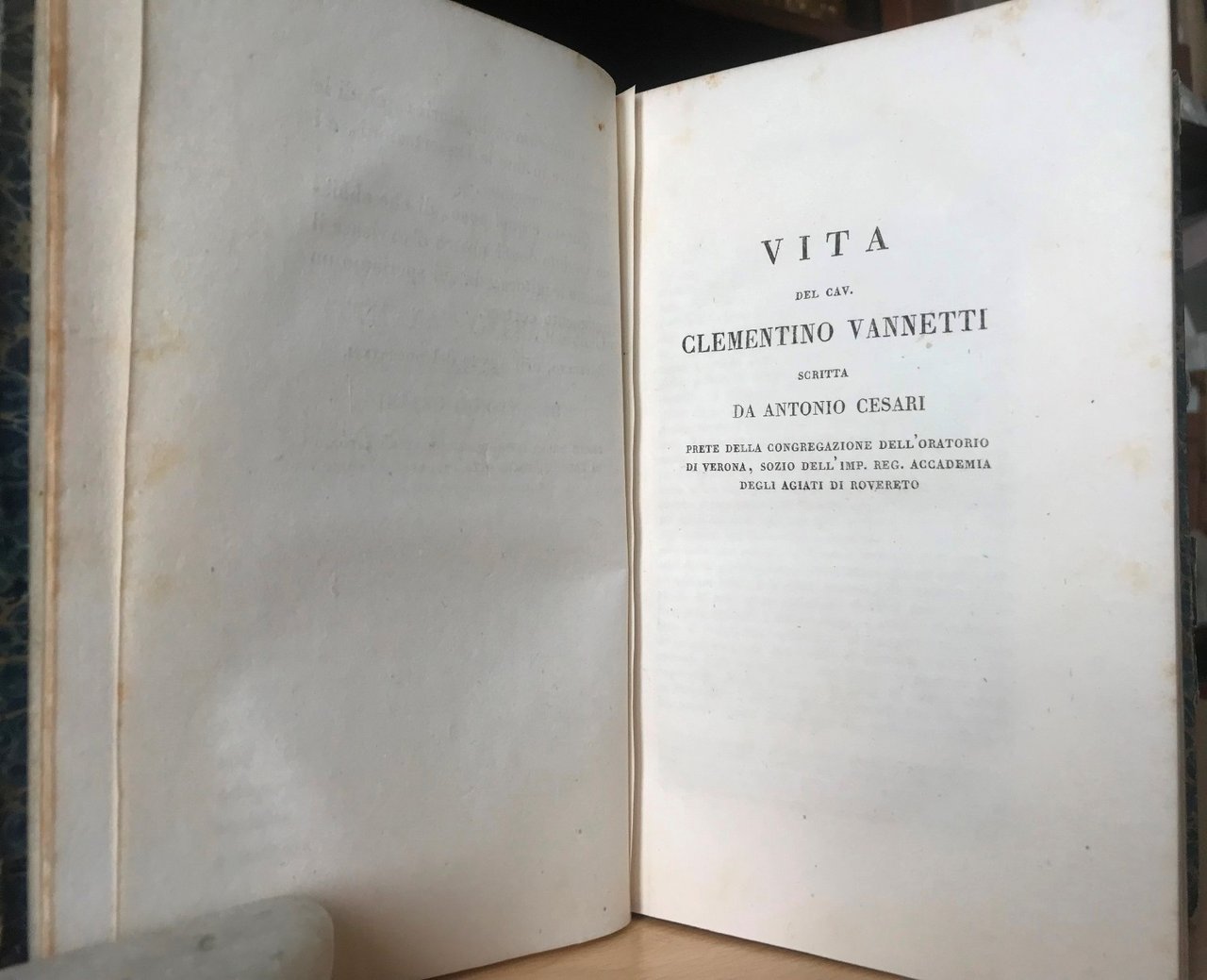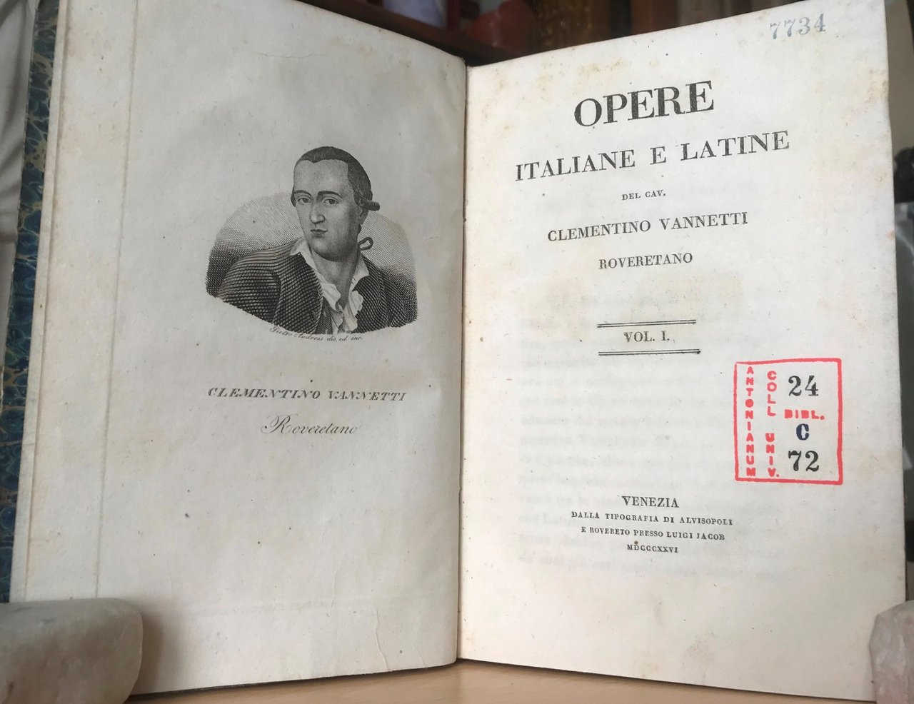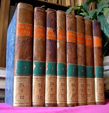 Opera in 8 volumi in 8, legatura coeva in mezza pelle e carta marmorizzata, titoli al tassello al dorso, sguardie, antiporta con ritratto dell'autore disegnato ed inciso in rame da Pietro Andreis, frontespizi, prefazione, Vita del C. Vannetti scritta da Antonio Cesari, (8) LXXI, 318 pp.; 296 pp.; XI (1), 300 pp.; 277 pp.; 311 pp.; 307 pp.; VIII, 322 pp., timbri di biblioteca estinta (antonianum). Preziosa e rara edizione di tutte le opere del letterato trentino (Rovereto 1754-1795). che raccoglie l'intera produzione letteraria affiancata a testi di interesse trentino e, al settimo volume, il famoso 'Liber memorialis de Caleostro quum esset Roboreti'. In ottimo stato di conservazione, perfetto, pulito, fatta eccezione per la sporadica presenza del citato timbro. Notevole.