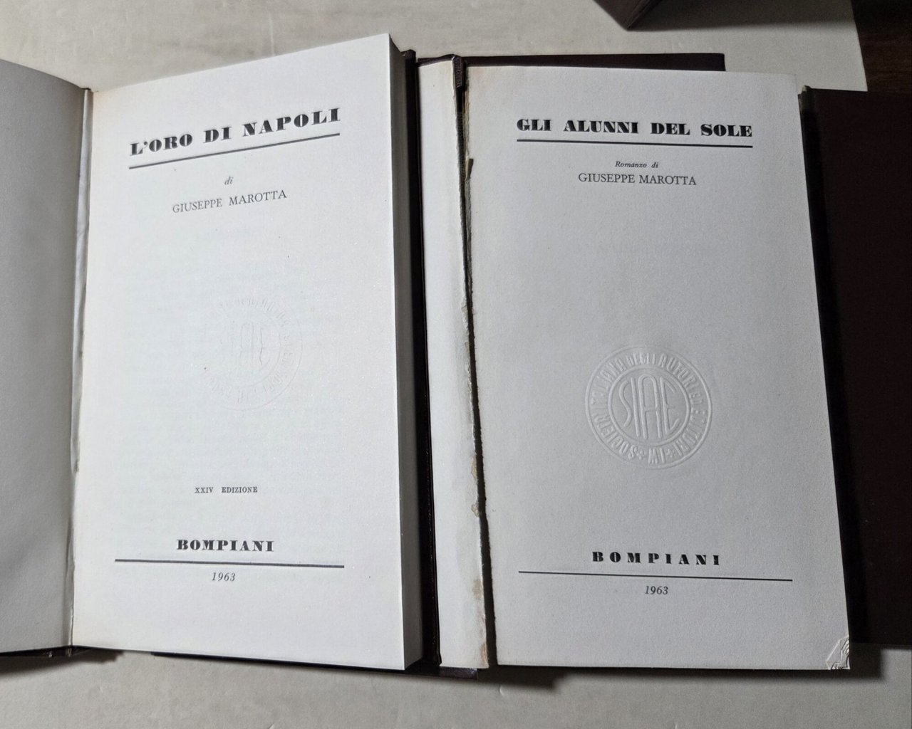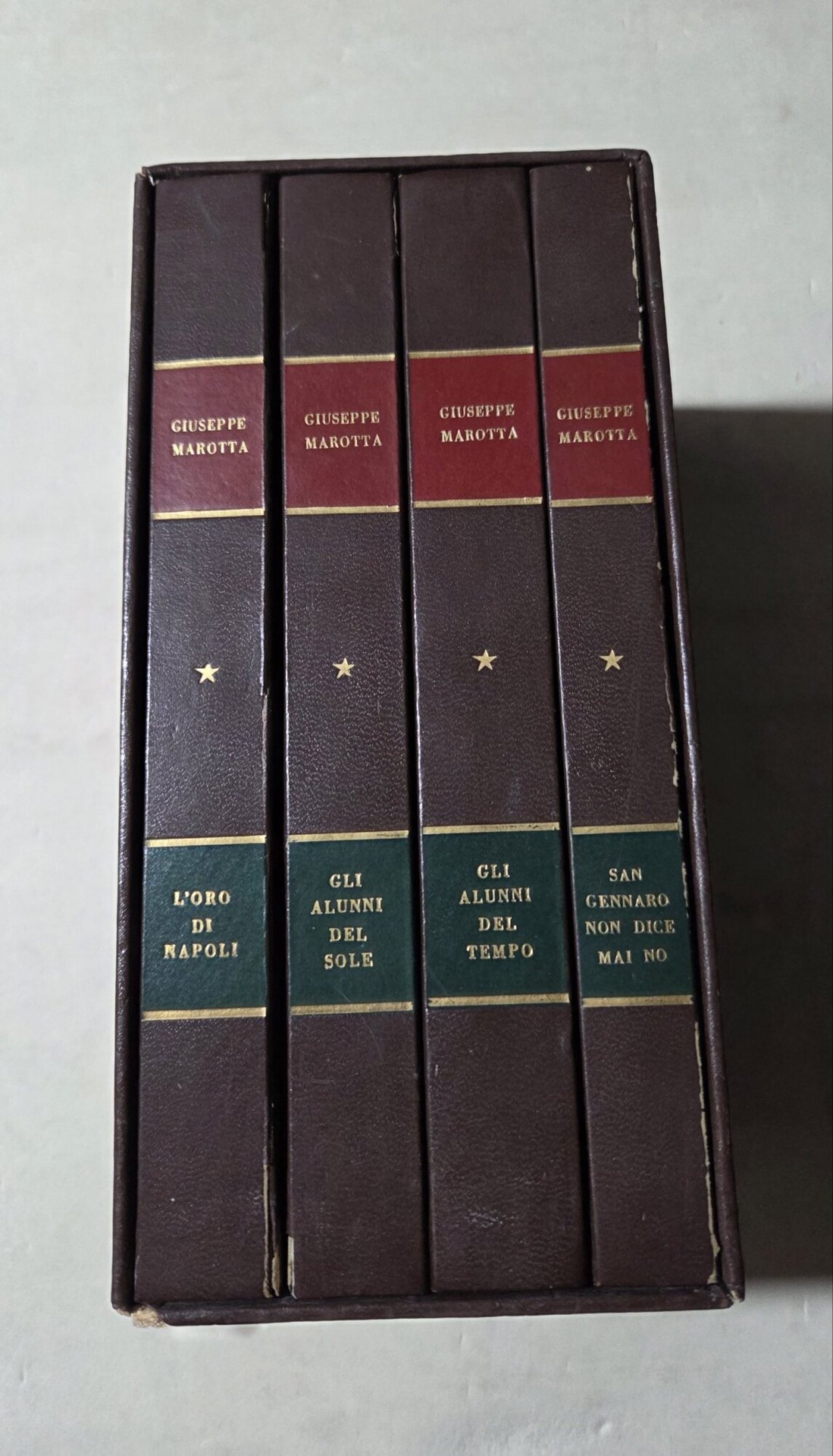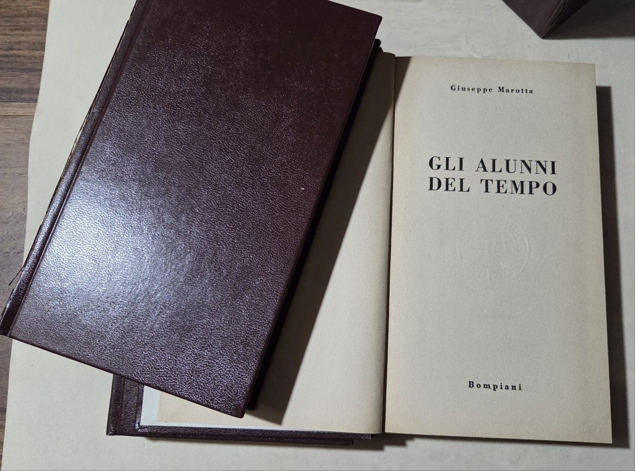 4 Voll. in 8', leg. ed. con cofanetto, pp. 275, 262, 232, 321; strappi all'imboccatura del cofanetto ad entrambe i tagli, coste staccate da un lembo su tutti i volumi, e fesssura alla cerniera interna al volume "Gli alunni del sole", pagine ingiallite e gore di colore verdastro al margine laterale de "Gli alunni del tempo". pagine interne in buono stato. ***Due to bureaucratic reasons, books dated over 70 years old cannot be immediately exported, please contact us before placing the order.***