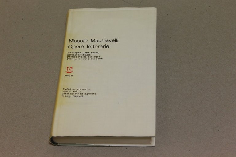 Niccolò Machiavelli Opere letterarie. Milano, Adelphi 1964 - I italiano, in sedicesimo pp.XL + 400 Opere letterarie. Mandragola, Clizia, Andria, Belfagor arcidiavolo, discorso intorno alla lingua, operette in versi e altri scritti. Prefazione commento nota al testo e appendici bio- bliografiche di Luigi Biasucci.