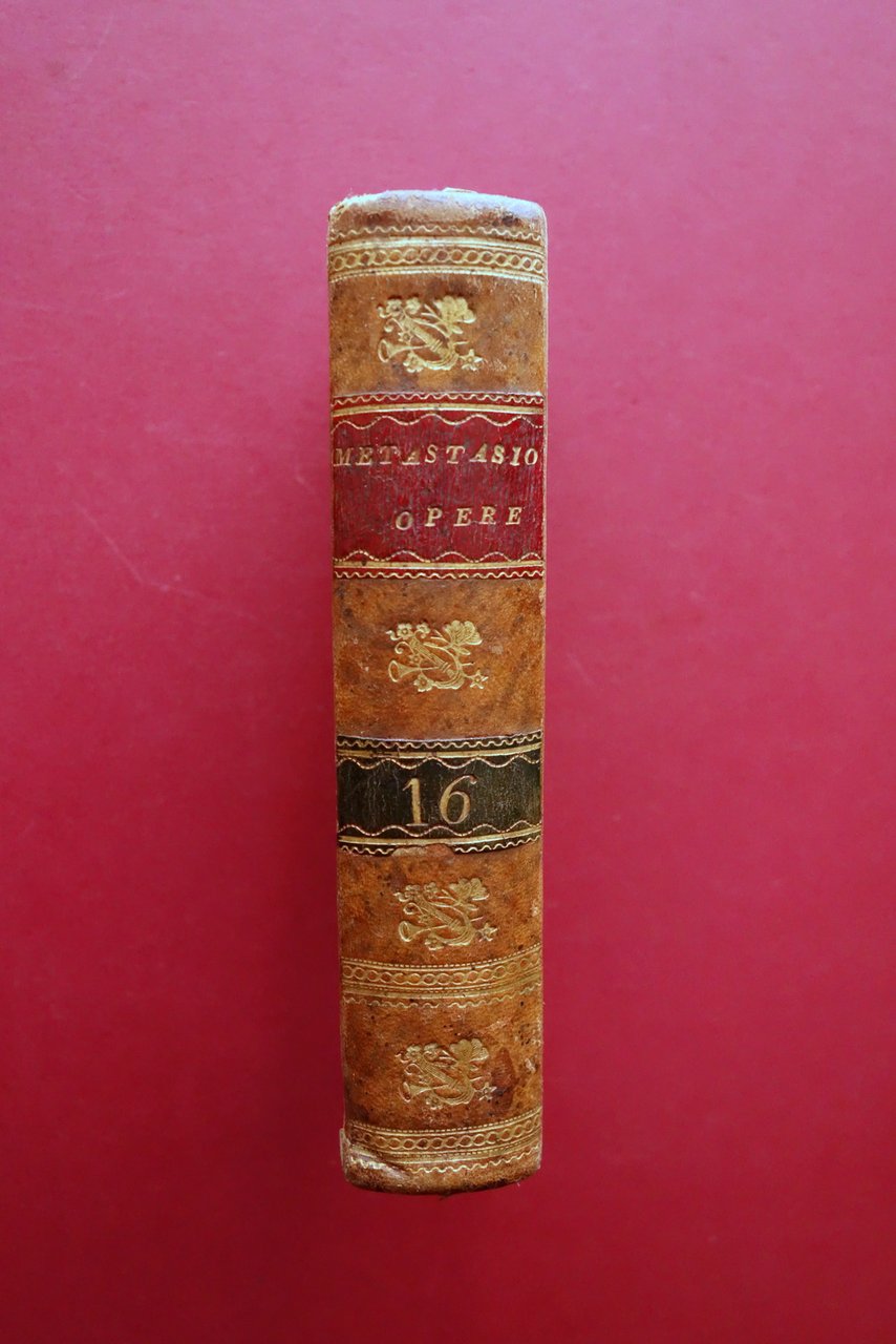 Settecentina, Opere Postume del Sig. Ab. Pietro Metastasio Poeta Cesareo che compariscono per la prima volta alla luce giusta l'Edizione di Parigi [.] Tomo XVI Presso Antonio Zatta, Venezia 1783; cm 16,5x9; pp. [2]-IV-384, più 10 belle tavv. incise in b/n a piena pagina; al frontespizio bel fregio inc. in b/n. Legatura d'epoca in mezza pelle con titolo e alcuni fregi impressi in oro al dorso (titolo e numero del volume entro tassello), piatti marmorizzati. Alla seconda di copertina applicato vecchio ex libris del precedente proprietario. Tomo XVI, dedicato alla disamina dell'arte poetica di Aristotele e di Orazio. Condizioni di conservazione Buone condizioni con normali tracce d'uso e leggeri segni del tempo; piatti con alcune piccole lievi abrasioni e piccole mancanze ai margini, dorso con alcune minuscole macchiette e lievi abrasioni, piccoli accenni di fessurazione alle estremità della cerniera anteriore. Interni buoni con leggero foxing; angolo inferiore di qualche pagina con traccia di piega. Il tomo XVI qui proposto raccoglie l' Estratto dell'Arte Poetica d'Aristotile"; "Dell'Arte Poetica. Epistola di Q. Orazio Flacco ai Pisoni." SETT90.L26285 N "