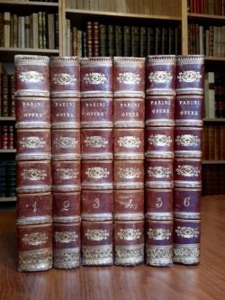 6 volumi in-8° (cm. 22), legature coeve in mezza pelle con titolo e graziosi fregi in oro ai dorsi, piatti e tagli marmorizzati; carta in ottimo stato, 1 tavola di ritratto in rame f.t. (F. Rosaspina); Ex Libris di biblioteca nobiliare ai contropiatti; allegata in fine a questo esemplare una lettera sciolta dell'editore a Francesco Venini in risposta all'accusa di plagio. Prima edizione delle opere del Parini. «Raccolta la più copiosa» [Gamba 2637] «pubblicata per sottoscrizione: nell'elenco degli abbonati posto in fine al V e VI vol. si trovano i nomi dei più eminenti personaggi dell'epoca come: Napoleone, Albertolli, Appiani, Bossi, Ugo Foscolo, Alessandro Manzoni, Vincenzo Monti, il Ministro Prina, Francesco Rosaspina, etc. etc.» [Hoepli 278]. Cfr. Brunet IV 370; Parenti 389. Esemplare molto buono. (NH1-2c)