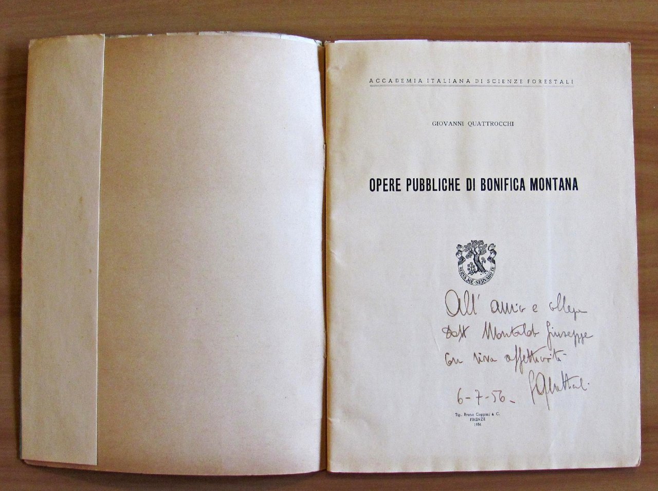 Accademia Italiana di Scienze Forestali. Illustrazioni fotografiche in b/n n.t. e 1 tavola f.t. a colori più volte ripiegata, brossura editoriale con sovracopertina originale. 19x26; pp.31. Dedica autografa dell'autore al frontespizio. Buonissime condizioni. pp.31. Dedica autografa dell'autore al frontespizio. BUONISSIMO STATO 31, Molto buono (Very Good)