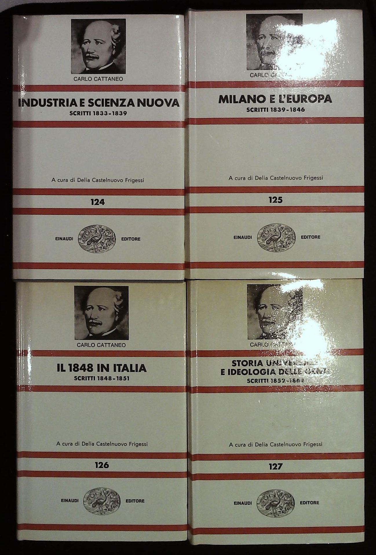 in 16° tela ed. sov. Volume I Industria e scienza nuova, scritti 1833 - 1839 pp. CVI - 364 / Volume II Milano e l'Europa, scritti 1839 - 1846 pp. 578 / Volume III Il 1848 in Italia, scritti 1848 - 1851 pp. 346 / Volume IV Storia universale e ideologia delle genti, scritti 1852 -1864 Coll. NUE Nuova Universale Einaudi n° 124 / 125 /126 / 127. In ottimo stato