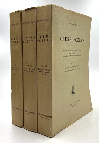 Opera completa, 3 volumi in brossura editoriale a stampa, cm18x26.5., pp pp VIII 530 (2), VIII 515 (5), VIII 467 (5); introduzione di Ugo Cassina. VOLUME I (1957): ANALISI MATEMATICA - CALCOLO NUMERICO. VOLUME II (1958): LOGICA MATEMATICA - INTERLINGUA ED ALGEBRA DELLA GRAMMATICA. VOLUME III (1960): GEOMETRIA E FONDAMENTI - MECCANICA RAZIONALE - VARIE. Molto ben conservati, a fogli chiusi; sul frontespizio di ciascun volume una piccola nota a penna e una a matita, lieve traccia di piega sul piatto posteriore del volume secondo.