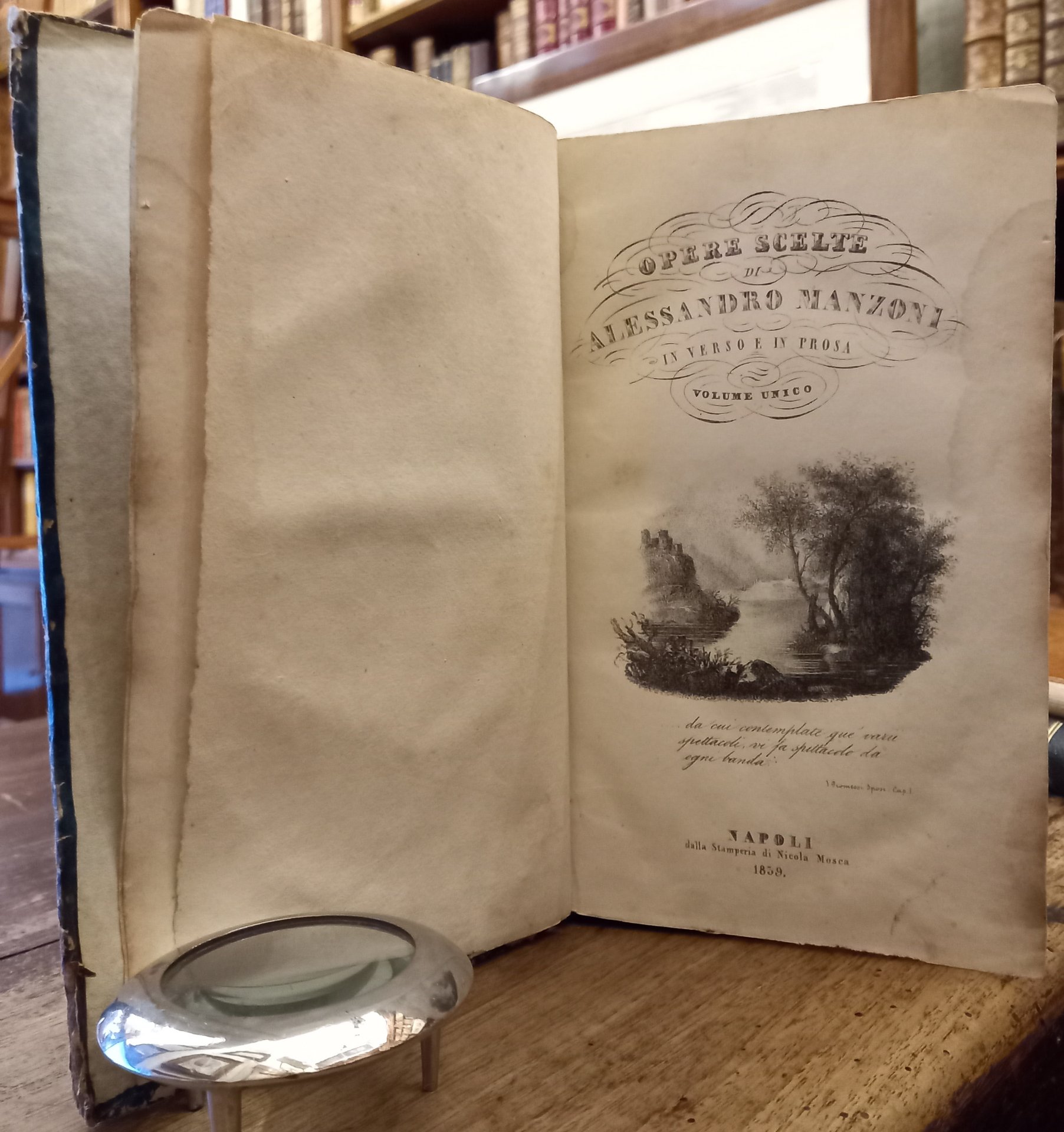 In-8 (21,5 cm) (2) (1) c. (di ritr.) (1) c. (frontespizio) 442 (4) (6) c. (tavole illustrate). Mezza pelle, piatti cartonati rivestiti di carta marmorizzata. Contiene: I Promessi Sposi seguiti da un commento; I Promessi Sposi in terza rima dell'avv. Lorenzo Del Nobolo; Im morte di Carlo Imbonati; Urania; A Francesco Lomonaco; Inni Sacri. Lieve alone di gora ai margini bianchi laterali esterni delle prime pagine. Buon esemplare. In-8(6)(1) c. (retracted) 442 (4) (6) c. (illustrated table). Half leather, cardboard plates covered with marbled paper. Contains: The Betrothed followed by a commentary; The Betrothed in third rhyme by the lawyer. Lorenzo Del Nobolo; Im death of Carlo Imbonati; urania; A Francesco Lomonaco; Sacred hymns. Only slight stain on the outer white margins of the first pages. Good copy.