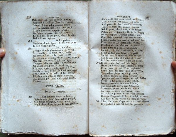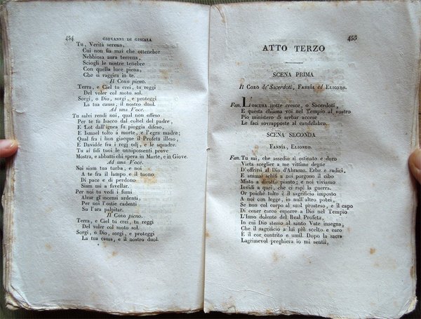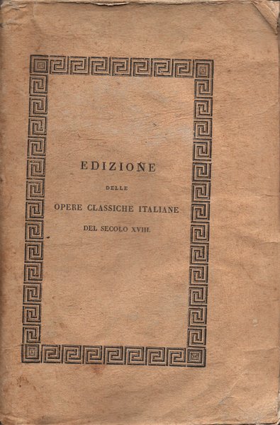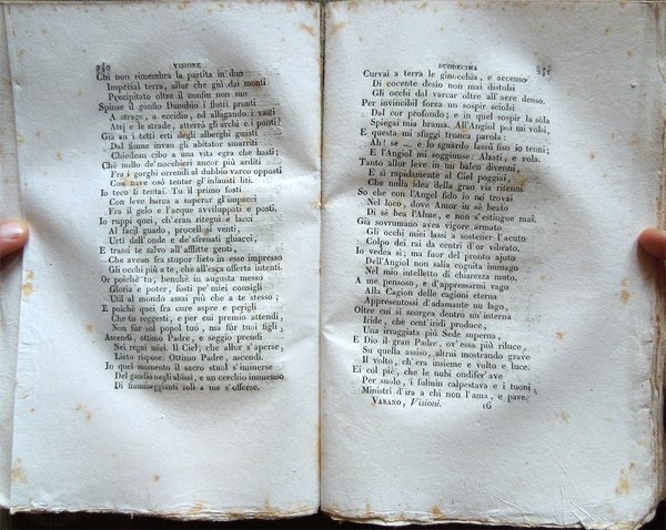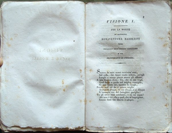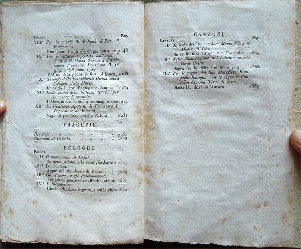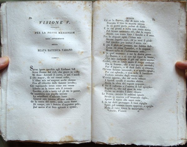 In-8° (22 x 14,5 cm), pp. XV, (1), 571, (5), copertina editoriale. Normali tracce d'uso e del tempo alla copertina, in particolare, piccole mancanze nella parte superiore e in quella inferiore del dorso. In antiporta, ritratto del Varano eseguito e inciso da Carlo Rampoldi. Qualche alone al frontespizio, alcune fioriture, per il resto buon esemplare, ad ampi margini, in barbe editoriali, parzialmente intonso. Indice: Notizie intorno alla vita di Alfonso Varano. Visioni. I. Per la morte di Monsig. Bonaventura Barberini; II. Per la morte di Anna Enrichetta di Borbone; III. Per la morte del Cardinale Cornelio Bentivoglio; IV. Sopra il vero e il falso onore; V. Per la peste messinese coll'apparizione della beata Battista Varano; VI. Per la morte della Serenissima Marianna Arciduchessa d'Austria ec.; VII. Pel terremoto di Lisbona; VIII. Per la morte di Felicita d'Este di Borbone ec.; IX. Per la vittoria riportata dall'armi di S. M. I. R. Maria Teresa d'Austria sopra l'esercito prussiano il 18 giugno dell'anno 1757; X. Trionfo della provvidenza divina sopra l'angelo della morte; XI. Della vanità della bellezza terrena per la morte d'Amennira; XII. La cristiana apoteosi di Francesco I imperatore de' Romani. Tragedie. Demetrio; Giovanni di Giscala. Egloghe. I. Il monumento di Dafni; II. La contesa; III. Gli augurj, e gli indovinamenti; IV. L'incantesimo. Canzoni. I. In lode all'Immacolata Maria Vergine madre di Dio; II. Nella risurrezione del Salvator nostro Gesù Cristo; III. Per le nozze del Sig. Marchese Bonifacio Rangone con la Signora Contessa Corona Terzi di Sissa.