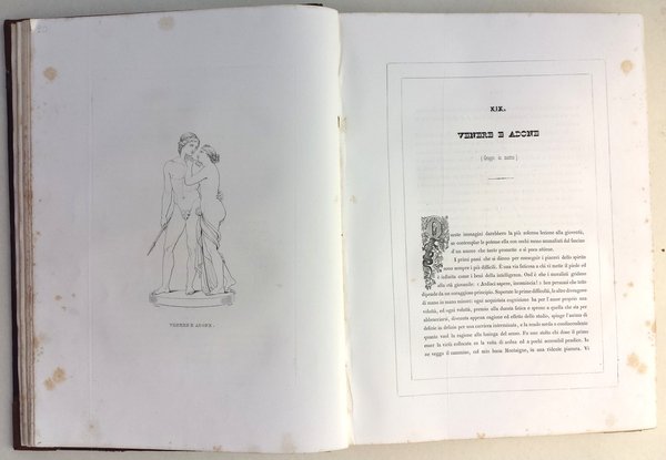 In-folio (38 cm) 216 (100) c. (di tavole). Piena pelle, fregi e caratteri dorati al dorso. Qualche fioritura. Collazionato e completo. Anzelmi Domenico (1803-1890): poeta, prosatore, redattore e direttore di testata. Antonio Canova (Possagno, 1º novembre 1757 – Venezia, 13 ottobre 1822) è stato uno scultore e pittore italiano, ritenuto il massimo esponente del Neoclassicismo e soprannominato per questo "il nuovo Fidia". Fu soprattutto il cantore della bellezza ideale, priva di affettazioni: basti a tale proposito ricordare le opere ispirate alle tre Grazie e a Ebe, oppure alcuni suoi capolavori come Venere uscente dal bagno, la Venere italica e la statua dedicata a Paolina Borghese. La sua arte e il suo genio ebbero una grande e decisiva influenza nella scultura dell'epoca.Iniziò giovanissimo il proprio apprendistato e lo svolse esclusivamente nella città di Venezia, distante circa 80 km dal suo paese natale, Possagno. Nella città lagunare iniziò a scolpire le sue prime opere. Egli subì, specialmente nel primo periodo di produzione artistica, l'influenza e il fascino dello scultore del Seicento Gian Lorenzo Bernini, indiscusso maestro dello stile barocco. Ventiduenne, si trasferì a Roma dove ebbe modo di incontrare e conoscere i maggiori protagonisti dell'arte neoclassica, inserendosi anch'egli in quel clima di capitale della cultura che era la città capitolina del Settecento. Gli è stato dedicato un asteroide, 6256 Canova.