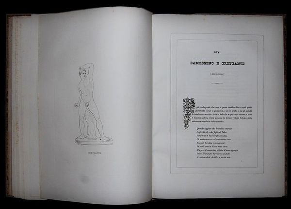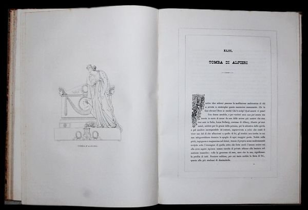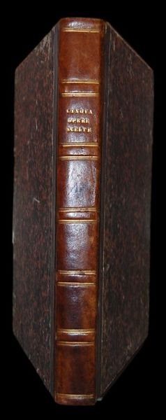 In folio (39×29 cm); 216 pp. e 100 magnifiche tavole fuori testo. Bella legatura coeva in mezza-pelle con dorso a 5 dorsi. Titolo, autore e filetti in oro ai tasselli. Piatti foderati con belle carte marmorizzate coeve. Qualche piccola e lievissima macchiolina di foxin al foglio di sguardia, ininfluente, e per il resto<BR>esemplare in ottime condizioni di conservazione. Completo. Prima edizione di questa importante monografia dedicata allopera del celebre pittore e scultore italiano, Antonio Canova (Possagno, 1º novembre 1757 Venezia, 13 ottobre 1822) che fu il massimo esponente della corrente del Neoclassicismo. Vicino alla teorie di Mengs e Winckelmann, Canova fu il più celebre scultore del suo tempo tanto che gli commissionarono opere gli Asburgo, i Borbone, la corte pontificia, Napoleone, sino ad arrivare dalla nobiltà veneta, romana e russa. Il volume qui presentato è di notevole importanza per ricostruire la genesi artistica dellopera di Canova. Ogni magnifica tavola è seguita da una descrizione e commento dellopera ad opera del noto poeta, prosatore e giornalista Domanico Anzelmo (1803-1890). Le tavole sono di altissimo livello incise su carta di ottima qualità da Revel su disegno di Canova. Molti esemplari dellopera presentano fioriture, per fortuna, assenti dalla nostra copia. Prima edizione in ottime condizioni di conservazione.