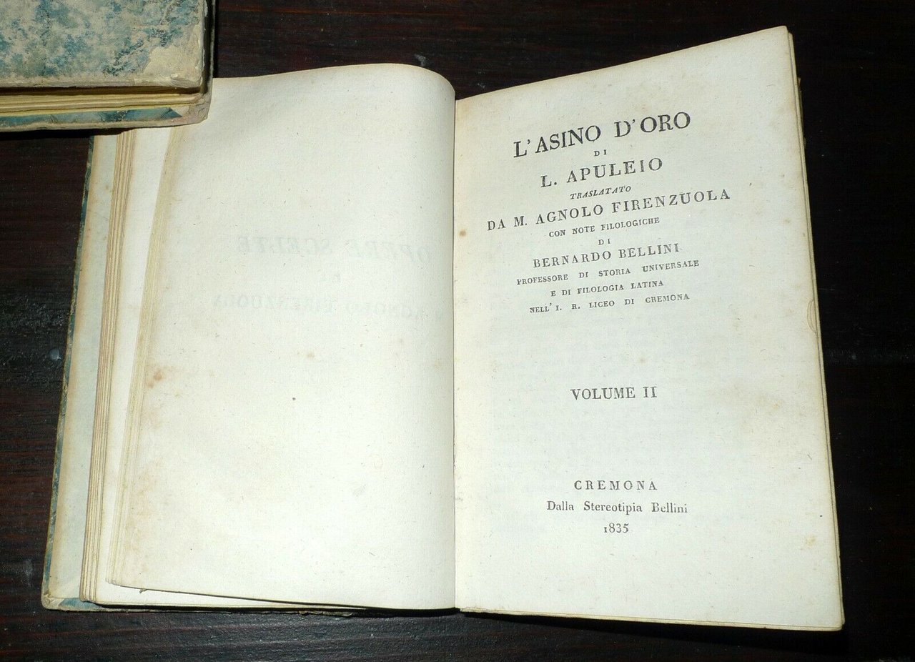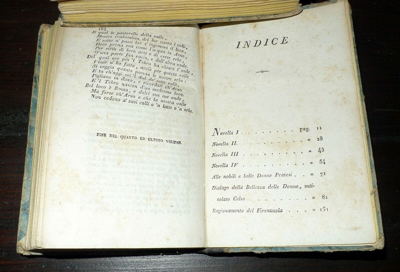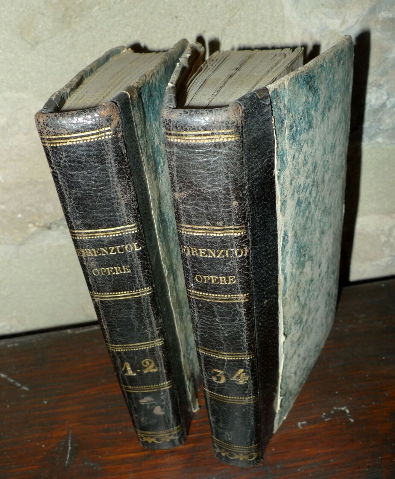 OPERE SCELTE DI MESSER AGNOLO FIRENZUOLAFIORENTINO.4 VOLUMI RILEGATI IN 2 [OPERA COMPLETA]- VOL.I-II: L'ASINO D'ORO DI APULEIO- VOL.III: LA PRIMA VESTE DE' DISCORSI DEGLI ANIMALI- VOL.IV: NOVELLE E DIALOGO SULLA BELLEZZA DELLE DONNE.Con note filologiche di Bernardo Bellini.Cremona, Dalla Stereotipia Bellini, 1835,copertina rigida, rilegatura in mezza pelle,pp.XIII-173;179;164;164,peso: g.475