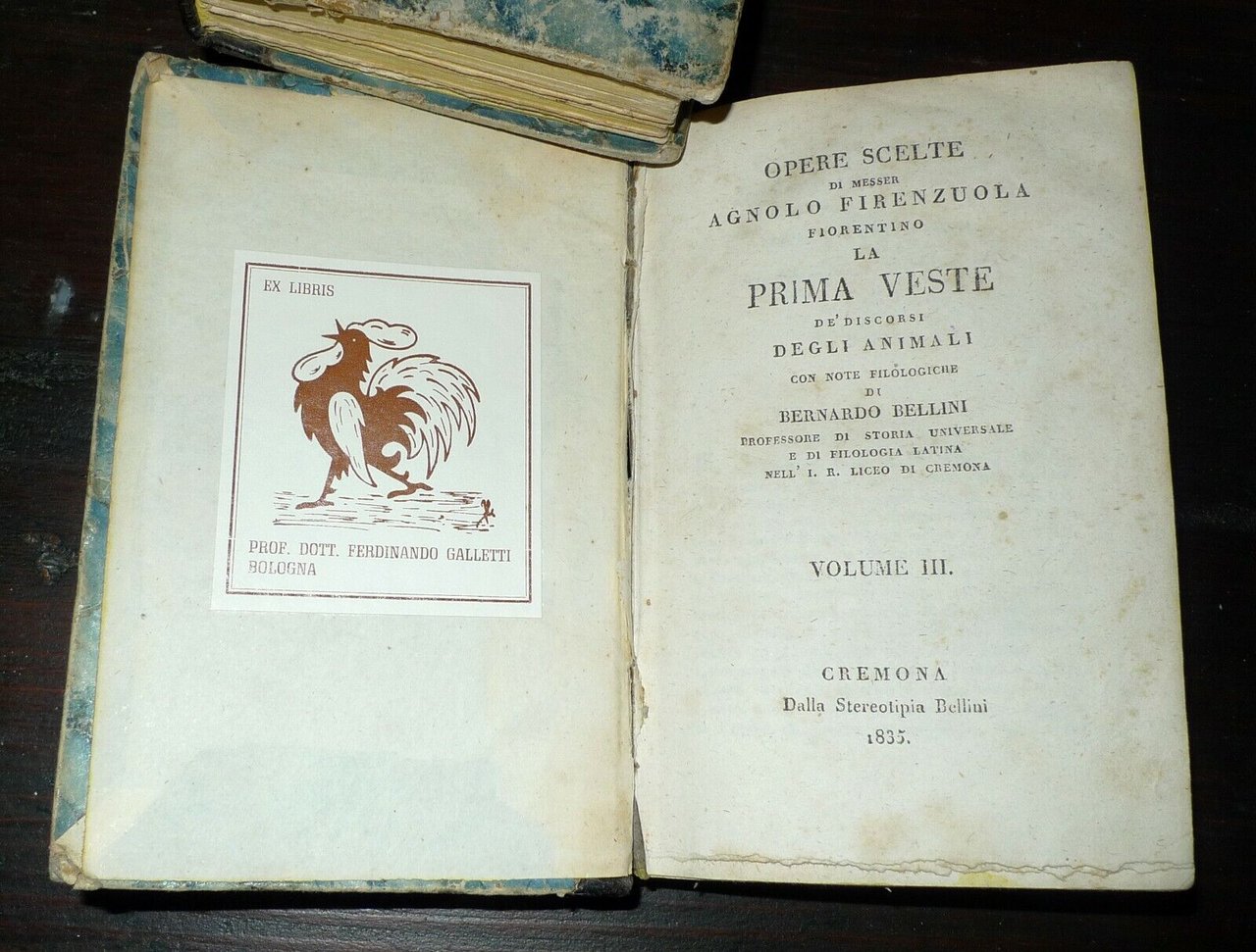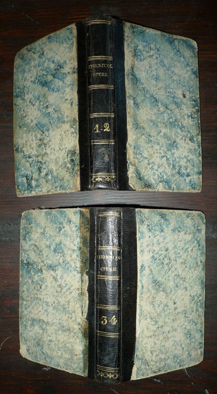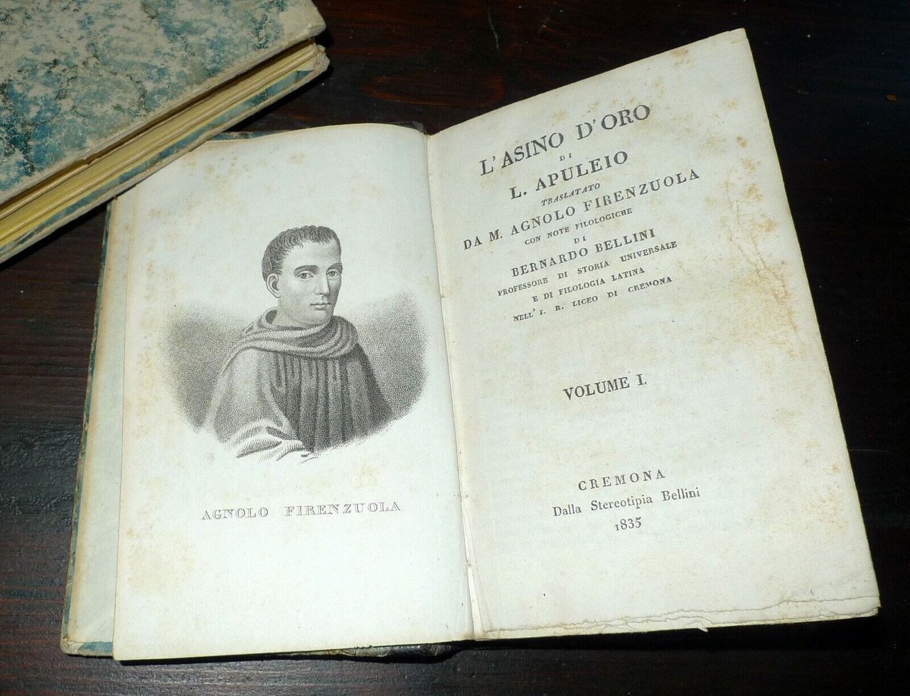 OPERE SCELTE DI MESSER AGNOLO FIRENZUOLAFIORENTINO.4 VOLUMI RILEGATI IN 2 [OPERA COMPLETA]- VOL.I-II: L'ASINO D'ORO DI APULEIO- VOL.III: LA PRIMA VESTE DE' DISCORSI DEGLI ANIMALI- VOL.IV: NOVELLE E DIALOGO SULLA BELLEZZA DELLE DONNE.Con note filologiche di Bernardo Bellini.Cremona, Dalla Stereotipia Bellini, 1835,copertina rigida, rilegatura in mezza pelle,pp.XIII-173;179;164;164,peso: g.475