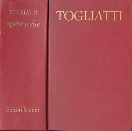 XII, 1190 p. ; 22 x 15 cm. Questa edizione delle "Opere scelte" di Palmiro Togliatti (1893-1964) - segretario del PCI e dirigente della Terza Internazionale -, mira a offrire al lettore una selezione ragionata dei principali scritti, discorsi e documenti della sua quasi cinquantennale attività intellettuale e politica. A cura di Gianpasquale Santomassimo. . Legatura editoriale, coperta in cartone rigido in similpelle rosso con impresso il cognome dell'autore in oro al piatto e al dorso. Manca la sovraccoperta originale. Qualche leggero segno del tempo ai risvolti, al taglio e alle pagine interne (ingiallimento della carta e qualche fioritura), per il resto libro in buono stato. Codice libreria 5743.