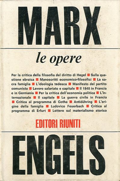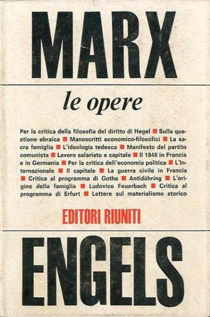 3. ed., 1. rist. XXIV, 1288 p. ; 22 x 15 cm. A cura di Luciano Gruppi. Traduzione di Delio Cantimori, Emma Cantimori Mezzamonti, Fausto Codino, Lucio Colletti, Giovanni De Caria, Dante Della Terza, Galvano della Volpe, Luciano Gruppi, Mario Rossi, Raniero Panzieri, Ernesto Ragionieri, Franco Rodano e Palmiro Togliatti. . Legatura editoriale, coperta in cartone rigido in similpelle di colore rosso, con titolo impresso in oro al piatto e al dorso, sovraccoperta a colori in carta plastificata. Qualche segno del tempo alla sovraccoperta, per il resto volume in buone condizioni. Codice libreria 5811.