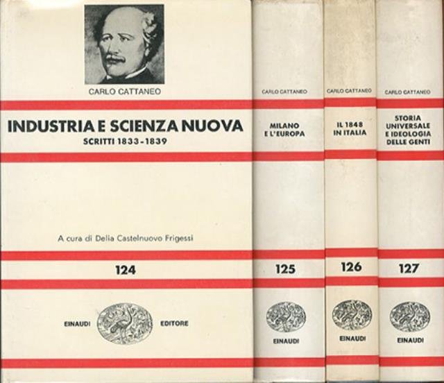 4 v. (CVI, 364; 578; 346; 504 p.) ; 18 x 12 cm. Nuova universale Einaudi, 124-125-126-127. Vol. 1: Industria e scienza nuova. Scritti 1833-1839; Vol. 2: Milano e l'Europa. Scritti 1839-1846; Vol. 3: Il 1848 in Italia. Scritti 1848-1851; Vol. 4; Storia universale e ideologie delle genti. Scritti 1852-1864. A cura di Delia Castelnuovo Frigessi. Legatura editoriale, coperta in cartone rigido telato di colore carta zucchero, titolo impresso in nero al dorso, muto il piatto. Sovraccoperta illustrata (b/n) in carta colorata (b/n e rosso) plastificata lucida. Codice libreria 7589.
