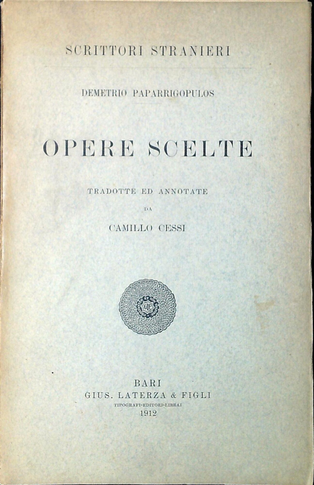 Paparrigopoulos, Dimitrios Opere scelte. Bari, Laterza 1912, 282 p. ; 22 cm. (71237)