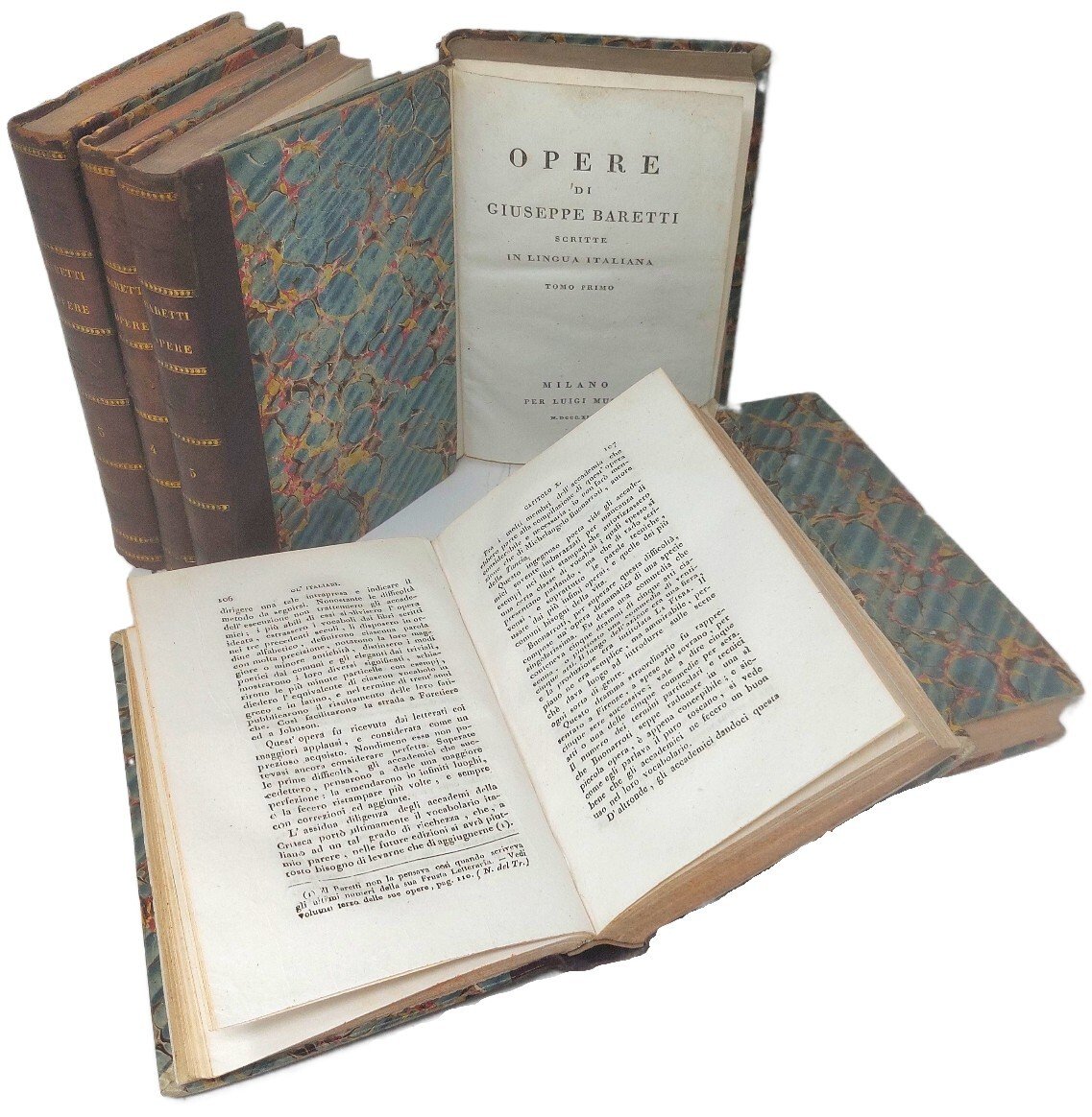 >7 vol. in 6 tomi, in-8, pregevole legatura del tempo m. pelle, titolo e fregi in oro ed a secco sui dorsi. Prima edizione collettiva delle opere scritte dal Baretti in lingua italiana. - Vol. I): pp. XLVI, (2), 332 (Vita di B. scritta dal conte Giuseppe Franchi di Pont; La Frusta Letteraria). - II): pp. 438 (continuazione de La Frusta Letteraria). - III): pp. 363 (conclusione de La Frusta Lett., aggiuntevi in fine tre lettere sopra un certo fatto del dottor Biagio Schiavo da Este). - IV) (ristampa di Pirotta 1819 della I ediz. Mussi 1814): pp. 32, 244 (Primo cicalamento sopra le cinque lettere di Gius. Bartoli; Le piacevoli poesie; Fetonte sulle rive del Po; Stanze al padre Serafino Bianchi da Novara; Canzoni nelle nozze del conte di Pertengo; Quattro epistole). - V): pp. VIII, 307 (Lettere familiari). - VI): pp. XIV, 288 (Gl'Italiani ossia relazione degli usi e costumi d'Itala, traduz. di Girolamo Pozzoli). - VII): (6), 131, (5), 16 (Discorso sopra Shakespeare ed il Sig. Di Voltaire, versione dal francese di Gir. Pozzoli; Poesie inedite). Ottimo esemplare Piccioni n. 1. DBIt. VI, p. 334.