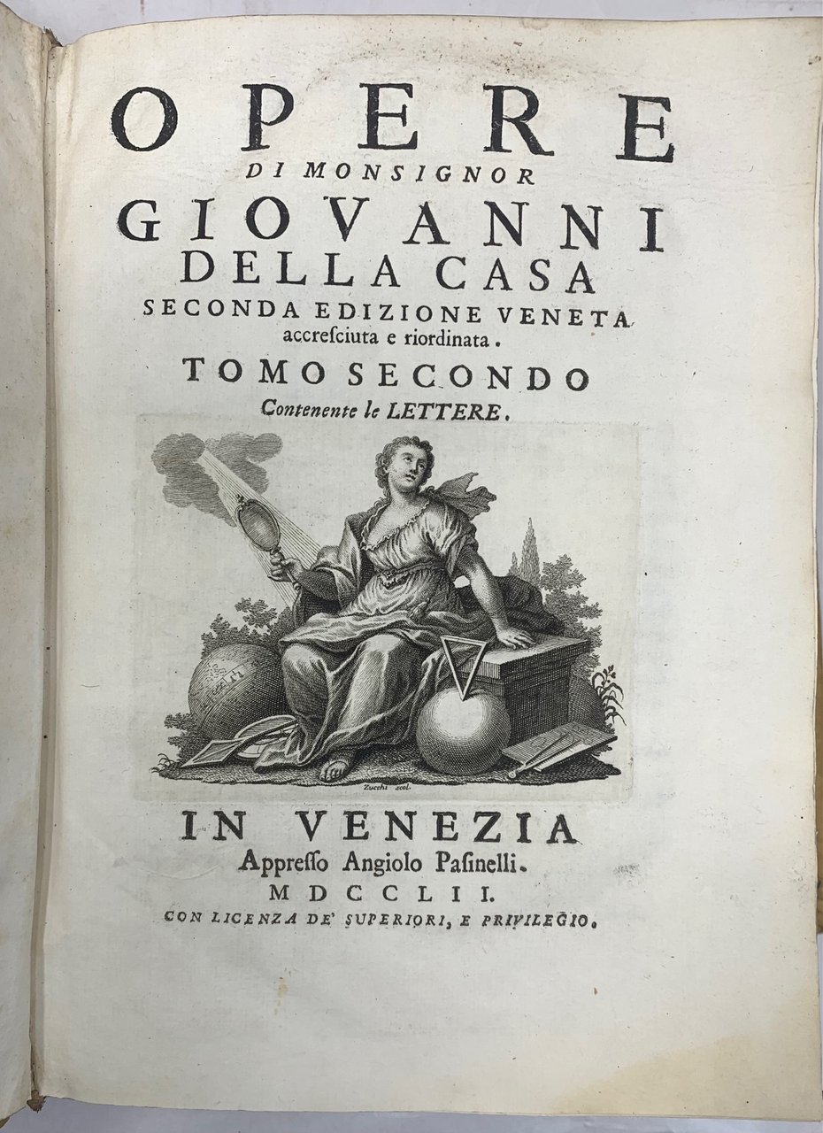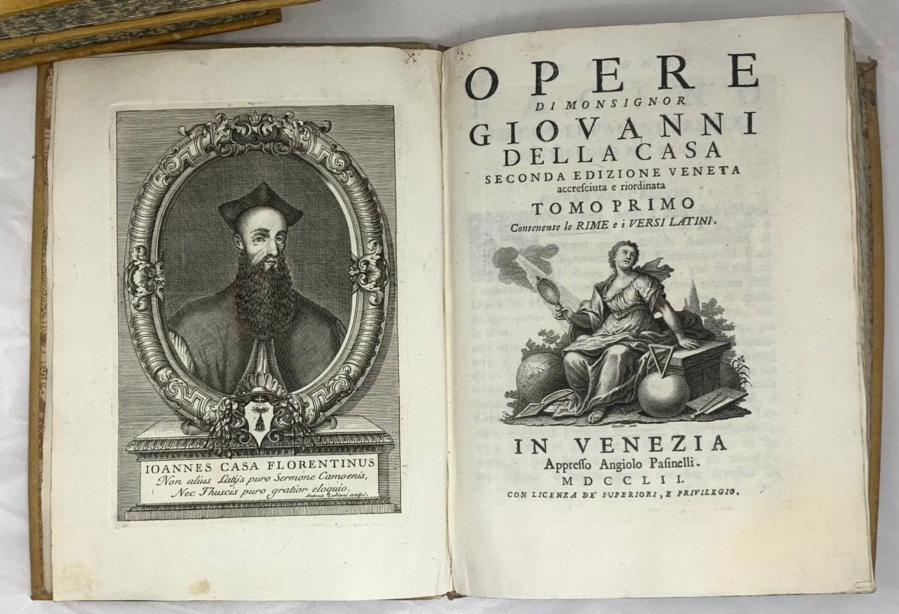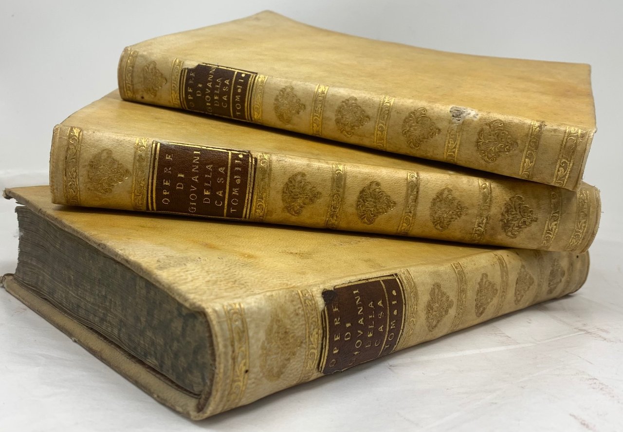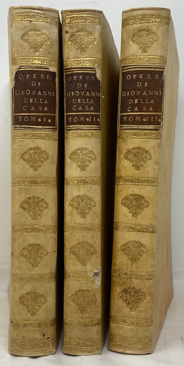 >3 vol. in-4, pp. (10), X, LXXX, 314: XXXI, 268; 356, 44. Legatura coeva piena pergamena, sguardie in carta decorata, tagli marmorizzati. Ritratto in ovale dell'autore inciso in rame da A. Luciani in antiporta al vol I; vignetta incisa da F. Zucchi ai 3 frontespizi e 3 testatine. Accuratissima ed elegante edizione, la più completa degli scritti letterari di Della Casa (Firenze 1503-1556), uno dei migliori prosatori italiani. Bell'esemplare. Gamba 290: ''Di questa nuova edizione si prese cura Marco Forcellini, riordinando le Opere, togliendo via molti commenti, e ponendo in luogo loro brevi Annotazioni, ed una Tavola di tutte le voci usate dal Casa. Poté arricchire questa stampa di 43 lettere non più stampate... e di un Discorso in materia politica indirizzato al Card. Caraffa ed al Casa attribuito.'' Morazzoni p. 226.