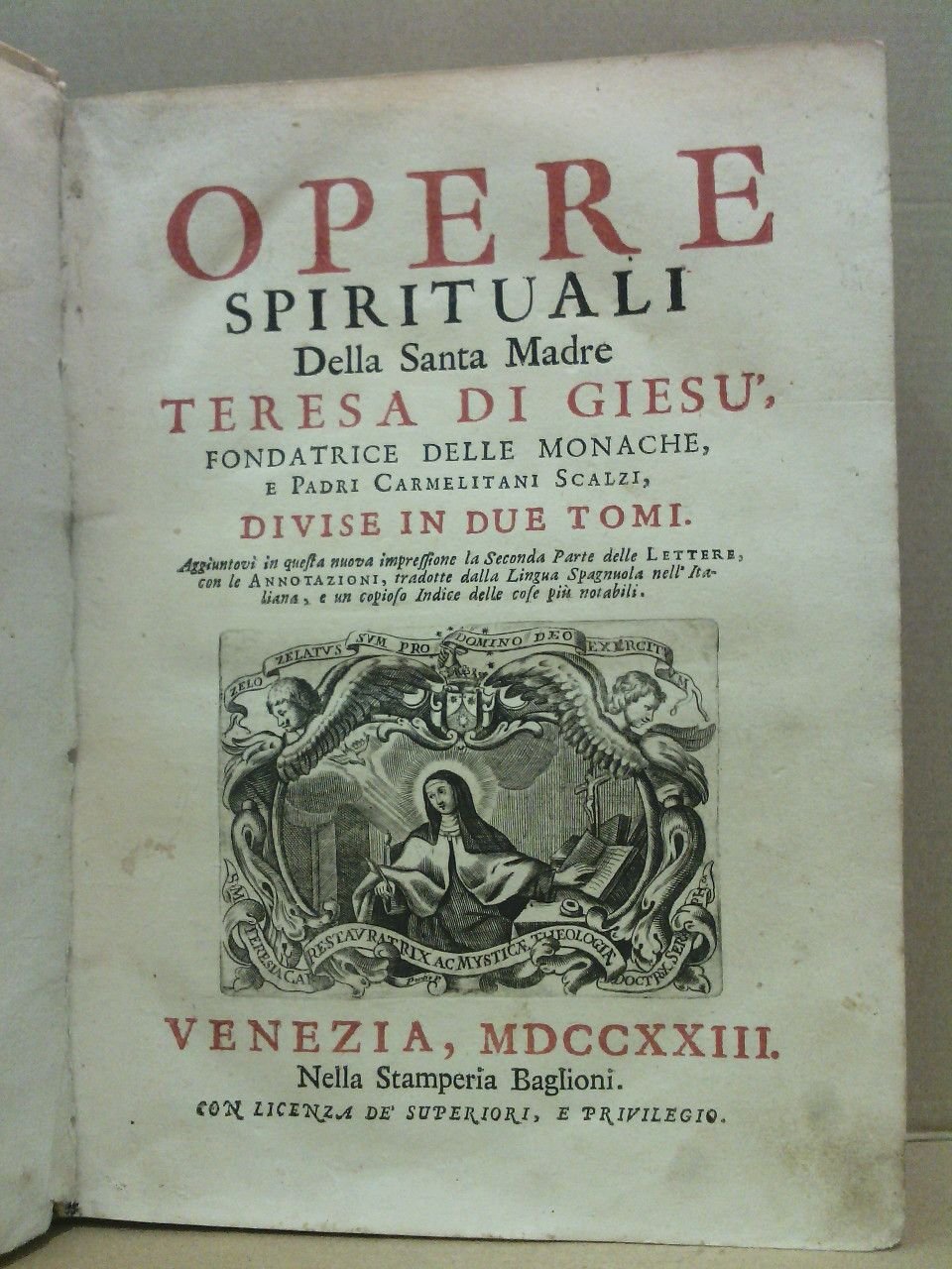 Venezia: Nella Stamoeria Bablioni, 1723.- 2 Tomos en un solo volumen (7 h., 313 p., 17 h; 322 p., 10 h.); 4º (24 x 18,5 cm); portada a 2 tintas, con un grabado al cobre, simbólico de la Santa; impresión a dos columnas; Pergamino Epoca.- RARO.* Falto de portadilla. Interior en excelente estado, tan solo las dos hojas siguientes a la portada tienen una pequeña señal de humedad en su parte inferior y en general algunas pequeñas manchas en el papel de forma difusa y poco acusadas. HISTORIA ECLESIÁSTICA, MÍSTICA Y TEOLOGÍA ESPAÑOLAS DE LOS SIGLOS XVI Y XVII