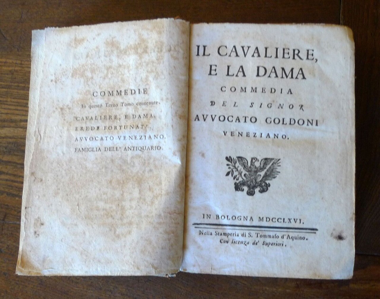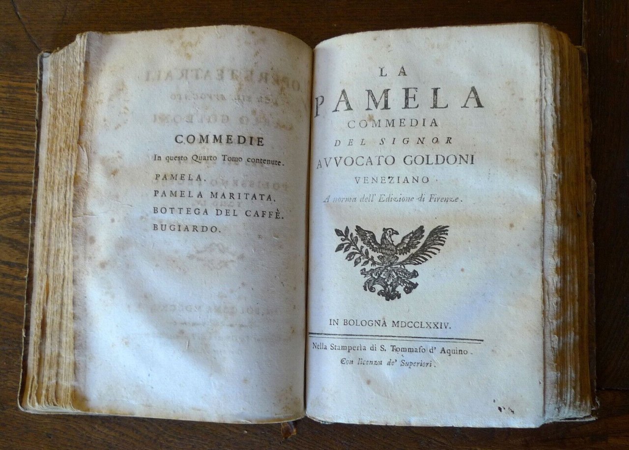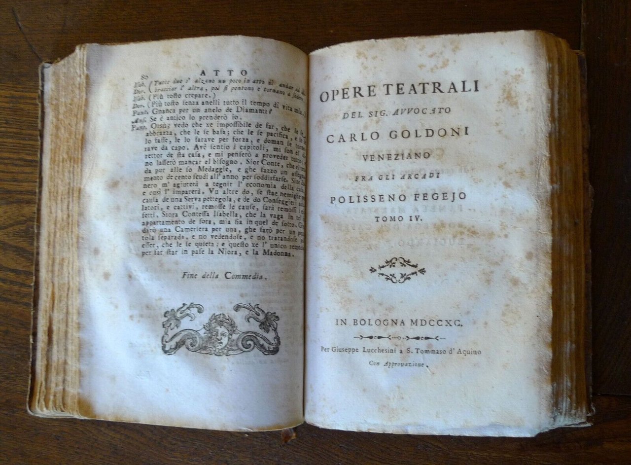 OPERE TEATRALI DEL SIG. AVVOCATOCARLO GOLDONIVENEZIANO FRA GLI ARCADI POLISSENO FEGEJO- TOMO IIIIL CAVALIERE E LA DAMA (1766) pp.78L'EREDE FORTUNATA (1766) pp.69L'AVVOCATO VENEZIANO (1790) pp.87LA FAMIGLIA DELL'ANTIQUARIO O SIALA SUOCERA, E LA NUORA (1766) pp.80- TOMO IVLA PAMELA (1774) pp.80LA PAMELA MARITATA (1775) pp.54LA BOTTEGA DEL CAFFÈ (1775) pp.72IL BUGIARDO (1787) pp.75[2 TOMI RILEGATI IN UN UNICO VOLUME, OPERA INCOMPLETA.Ogni commedia ha frontespizio, data di stampae numerazione delle pagine propri].IN BOLOGNA, MDCCXC (1790)Per Giuseppe Lucchesini a S.Tommaso d'Aquino,copertina rigida, rilegatura in mezza pelle,20x13 cm.,peso: g.650