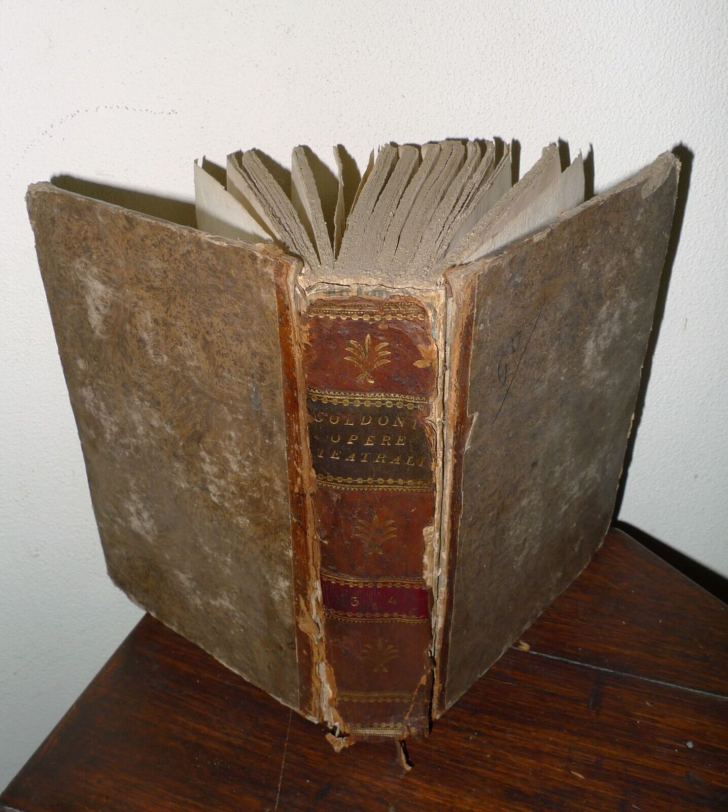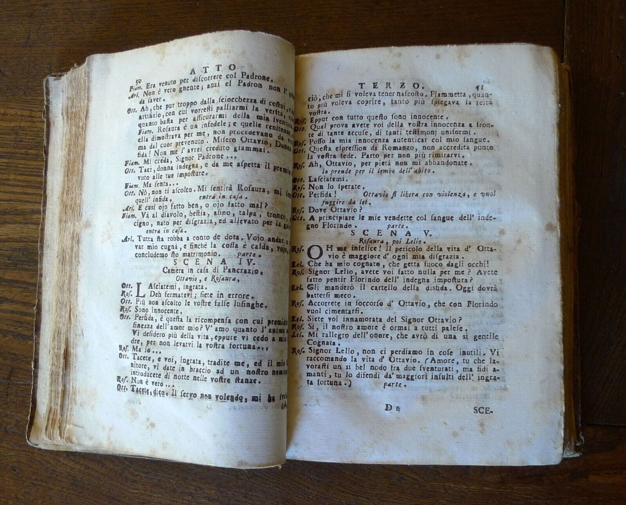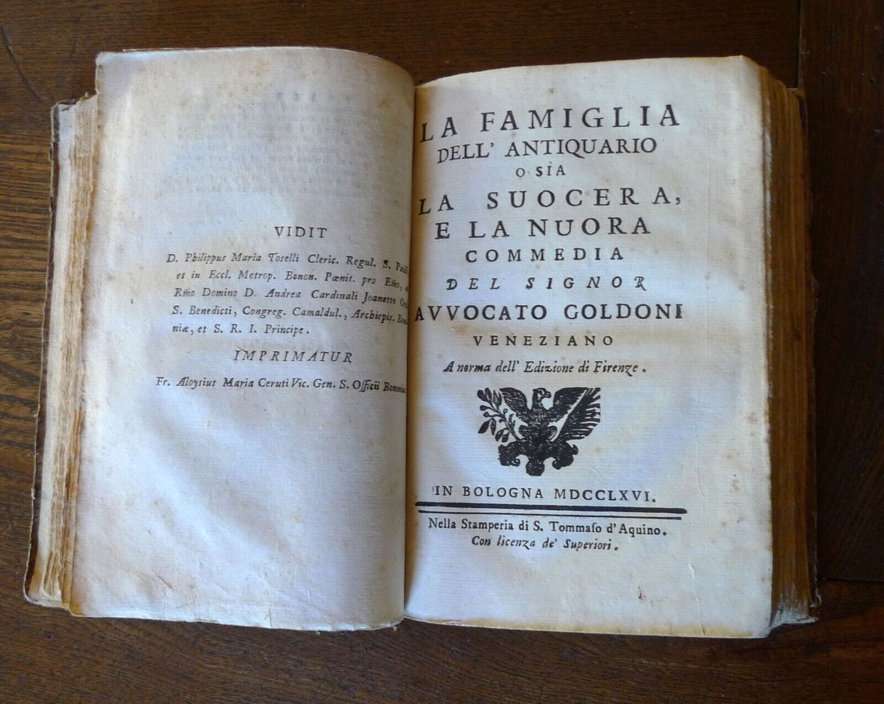 OPERE TEATRALI DEL SIG. AVVOCATOCARLO GOLDONIVENEZIANO FRA GLI ARCADI POLISSENO FEGEJO- TOMO IIIIL CAVALIERE E LA DAMA (1766) pp.78L'EREDE FORTUNATA (1766) pp.69L'AVVOCATO VENEZIANO (1790) pp.87LA FAMIGLIA DELL'ANTIQUARIO O SIALA SUOCERA, E LA NUORA (1766) pp.80- TOMO IVLA PAMELA (1774) pp.80LA PAMELA MARITATA (1775) pp.54LA BOTTEGA DEL CAFFÈ (1775) pp.72IL BUGIARDO (1787) pp.75[2 TOMI RILEGATI IN UN UNICO VOLUME, OPERA INCOMPLETA.Ogni commedia ha frontespizio, data di stampae numerazione delle pagine propri].IN BOLOGNA, MDCCXC (1790)Per Giuseppe Lucchesini a S.Tommaso d'Aquino,copertina rigida, rilegatura in mezza pelle,20x13 cm.,peso: g.650