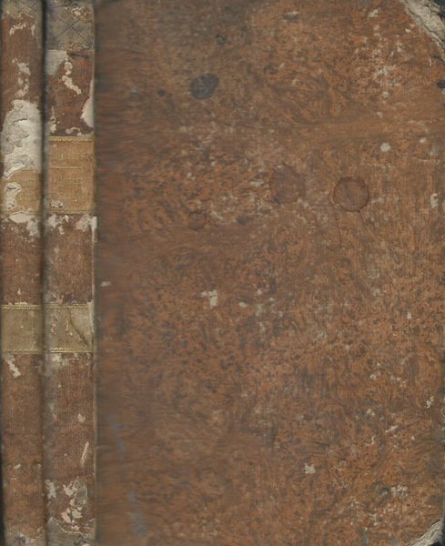 Opera incompleta, vol. I e vol. IV, editi rispettivamente nel 1820 e 1821 e di 93 e 80 pagine. Legatura in cartonato marmorizzato, con titoli dorati al dorso ed al vol. IV non più leggibili, segnata dal tempo, con numerose abrasioni e mancanze, con angoli usurati e strappo alla cerniera al vol. I. Pagine leggermente brunite, con ampio margine e fioriture sparse ed, al vol. I, con macchia di inchiostro nero al margine davanti, a partire dal frontespizio fino ad arrivare alla numero 106, rimpiccolendosi però di pagina in pagina. Disegno a matita alla controguardia anteriore del vol. I, tracce di inchiostro nero e piccola annotazione all'ultime pagine bianche dello stesso volume. Al termine del vol. IV invece, lettera, su pagine non numerate, di Stanislao Marchisio al Signor Antonio Bazzarini editore. Numero complessivo di pagine 173.