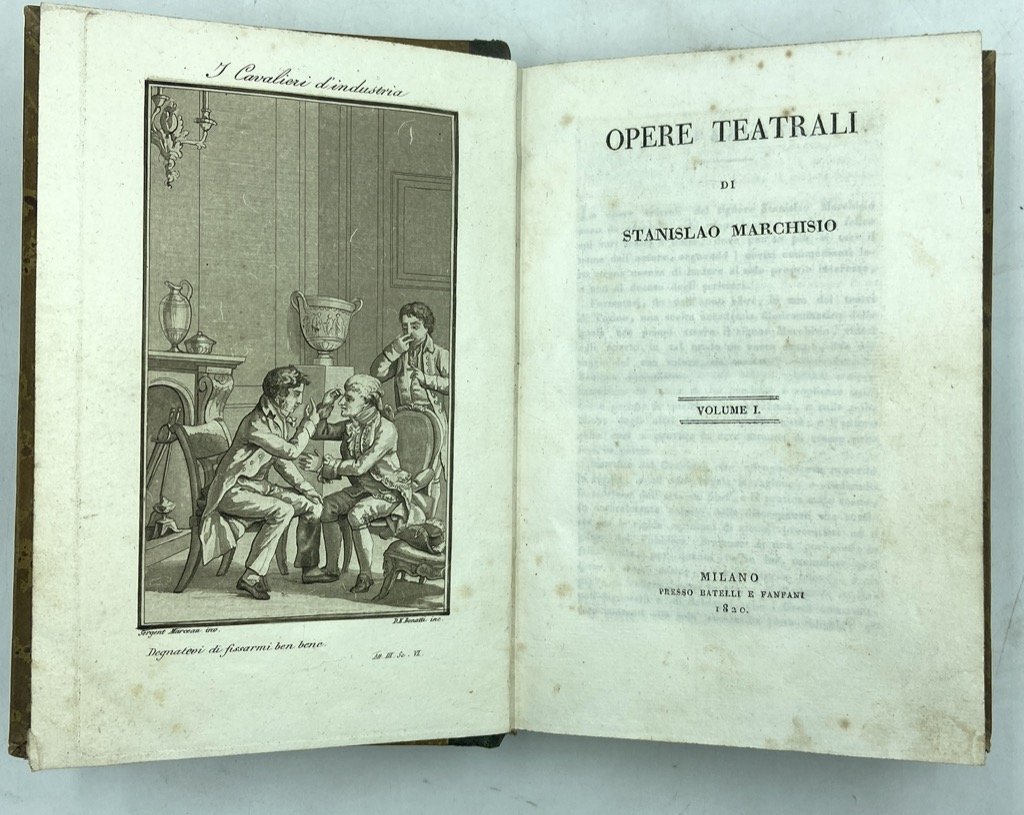 Quattro volumi legati in due tomi in ottavo, cm 21x14, legatura in mezza pelle con fregi a secco, titoli e filetti dorati sul dorso, piatti marmorizzati, pp XIV 124 93 (1), 142 (2) 99 (1), 116 129 (1), IX (1) 79 (1) 80 (6), ciascuna opera con antiporta incisa. Antiche note di possesso manoscritte sulle sguardie anteriori, lievi segni d'uso sulle legature, qualche lieve occasionale arrossamento e alone. Prima edizione della raccolta di commedie di Stanislao Marchisio, letterato autodidatta di umili origini, commerciante per mestiere ma «vero e proprio animale teatrale» commediografo, attore e impresario; agli esordi imitatore di Goldoni, sviluppò un proprio stile di commedia "romantica", incentrata all'intreccio romanzesco e avventuroso e la caratterizzazione psicologica dei personaggi, spesso di ambientazione londinese o nordica. La raccolta comprende le commedie I CAVALIERI D'INDUSTRIA, LA VERA E LA FALSA AMICIZIA, LA BORSA PERDUTA, L'INIMICO DELLE DONNE, PROBITÀ ED AMBIZIONE, IL FALSO OFFICIOSO e le tragedie SAFFO e MILETO, quasi tutte rappresentate nei primissimi anni del secolo a Torino dall'Accademia Filodrammatica e dalla Comica Compagnia Paganini. Tra le epistole e note dell'autore, che accompagnano i testi, si nota quella in calce al quarto volume, rivolta all'editore Antonio Barazzini; questi aveva pubblicato nelle sue Varietà Teatrali una commedia di Marchisio accompagnata da cenni biografici che gli attribuivano una laurea e una famiglia fornita di «dovizia di beni e di fortuna», ad entrambe le notizie l'autore risponde con puntiglio rivendicando la povertà dei suoi genitori «al verde da parecchi anni» e «l'onorata mia professione» di commerciante. Le otto tavole all'acquatinta sono opera dell'incisore Domenico Klemi Bonatti (Venezia 1794, attivo a Milano fino alla metà dell'Ottocento) da invenzione di Sergent-Marceau, artista e politico francese che, inviso a Bonaparte, si era rifugiato in Italia nel primo quarto del XIX secolo.
