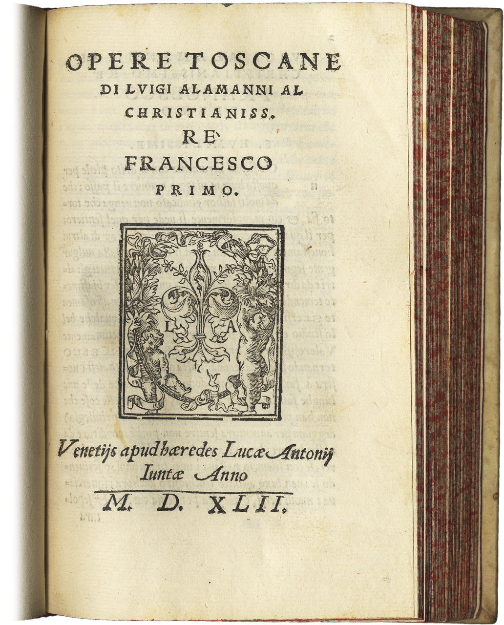 >2 tomi in un vol. in-8, pp. (16), 431; 295, (9, ultime due bianche), carattere corsivo, bella leg. 700sca in pergamena avorio, riquadro di filetti conterminazioni floreali, titolo su tassello al dorso. Impresa tipografica dei Giunta su ambedue i frontespizi, ripetuta a piena pag. in fine al tomo II. A differenza della prima edizione di Firenze (Giunti 1532) che si fermò al primo vol. e come altre edizioni fu messa al rogo, la presente raccoglie tutte le opere dell'Alamanni (30 elegie, 14 egloghe, 178 sonetti, Favola di Narciso, Diluvio romano, Favola di Atlante, 12 satire, Salmi penitenziali tradotti, 17 Selve, Favola di Fetonte, Antigone, 8 inni, Stanze, 68 sonetti). Luigi Alamanni (Firenze 1495 - Parigi 1556) fu illustre letterato e uomo politico negli ultimi periodi della Repubblica fiorentina, caduta la quale andò esulte in Francia ove ebbe grandi onori da Francesco I e Enrico II. Bell'esemplare, antica firma di possesso sbiadita al frontespizio. Gamba n.15. Camerini, Annali, n.465 ''Edizione assai elegante, citata dagli Accademici della Crusca''.