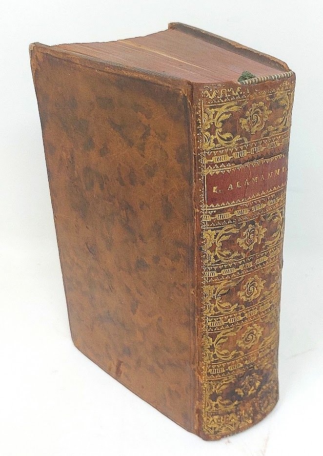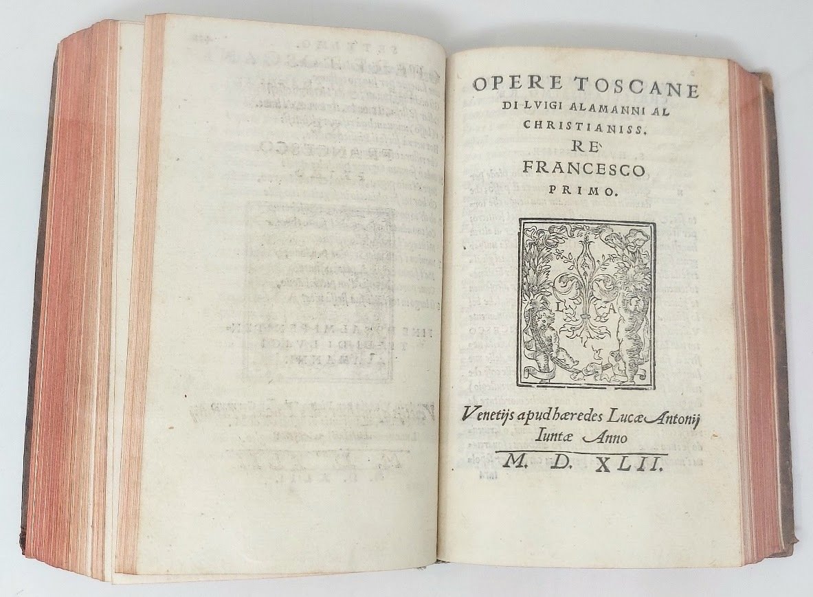 >2 parti in un vol. in-8, pp. (16), 431; 295, (9, ultime due bianche), carattere corsivo, bella legatura 700sca in pieno vitello, titolo su tassello granata e ricchi fregi floreali al dorso, tagli rossi. Marca tipografica dei Giunta, "giglio fiorentino e iniziali L A circondato da ghirlanda sorretta da 2 putti", posta su ambedue i frontespizi ed a piena pagina in fine al tomo II. A differenza della prima edizione di Firenze (Giunti 1532) che si fermò al primo volume, come altre edizioni messe al rogo, la presente raccoglie tutte le opere dell'Alamanni (30 elegie, 14 egloghe, 178 sonetti, Favola di Narciso, Diluvio romano, Favola di Atlante, 12 satire, Salmi penitenziali tradotti, 17 Selve, Favola di Fetonte, Antigone, 8 inni, Stanze, 68 sonetti). Luigi Alamanni (Firenze 1495 - Parigi 1556) fu illustre letterato e uomo politico negli ultimi periodi della Repubblica fiorentina, caduta la quale andò esule in Francia ove ebbe grandi onori da Francesco I e Enrico II. Bell'esemplare, due macchiette marroni al foglio di titolo. Gamba n.15. Camerini, Annali, n.465 ''Edizione assai elegante, citata dagli Accademici della Crusca''.