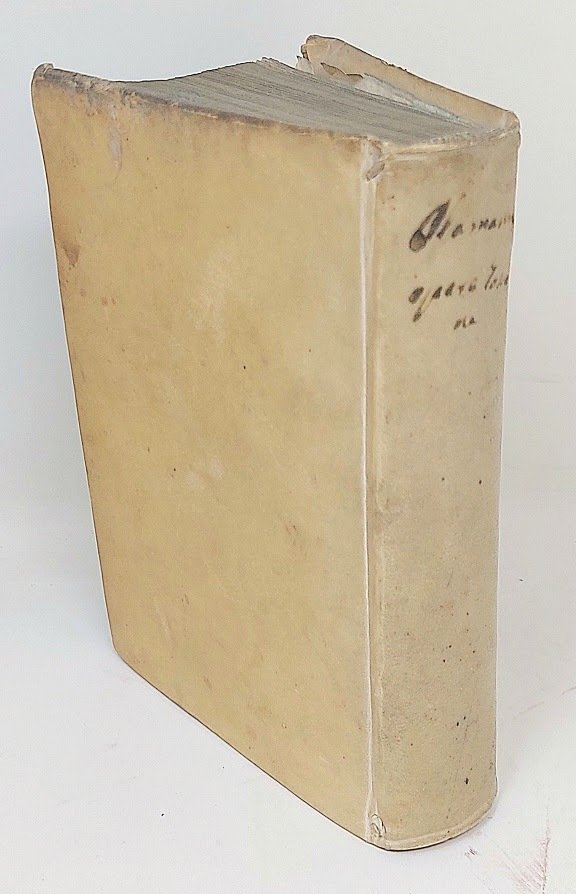 >in-8 (152x95), pp. (8), 435, (13), legatura coeva piena pergamena rigida, titolo ms. al dorso, tagli blu. Impresa tipografica al titolo "nutriscuo, estinguo...", altra diversa in fine, testo in carattere corsivo, spazio con lettera-guida per le iniziali.