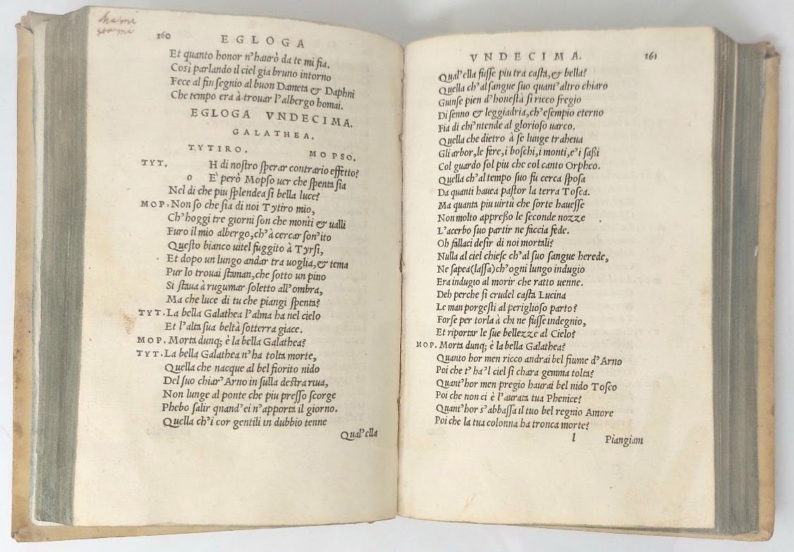 Prima edizione della prima parte (la seconda uscirà l'anno seguente) della celebre opera (la contemporanea edizione fiorentina di Giunta è ritenuta posteriore dai bibliografi). Questa prima parte, che può stare a sé, contiene 30 elegie, 14 egloghe, 178 sonetti con 5 ballate e 2 canzoni; la Favola di Narciso in ottava rima; il Diluvio romano e la Favola di Atlante; 12 satire e i sette Salmi Penitenziali in terza rima.