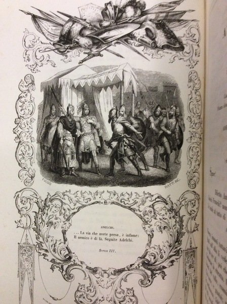 In-8 gr. (mm. 271x176), mz. pelle coeva con ang., dorso a cordoni con fregi e titolo oro, pp. 878, testo inquadrato in doppio filetto, molto ben illustrato da 10 tavole a piena pag. nel testo, disegnate da Focosi e inc. su legno da Ratti, con le cornici decorative eseguite da Fiorentini. Le testate e i capilettera (pure xilografati) che adornano gli "Inni Sacri" sono stati eseguiti su disegni di Focosi, Paolo Riccardi, Salvator Mazza. "Edizione originale" completa della dispensa aggiuntiva, quasi sempre mancante, uscita nel 1860 e contenente: "Marzo 1821" ed il "Proclama di Rimini" (gia' pubblicati nel 1848).Vi sono contenute: l'Adelchi (2a ediz. dell'autore) - il Discorso sulla Storia Longobardica in Italia - il Conte di Carmagnola (2a ediz.) - la Lettre sur l'unité de temps et de lieu dans la tragédie (2a ediz.) - del Romanzo Storico.. - il Dialogo dell'Invenzione - la Lettera a Giacinto Carena sulla Lingua Italiana - le Osservazioni sulla Morale Cattolica (2a ediz.) - gli Inni Sacri (3a ediz.) - le Strofe per una Prima Comunione - il Cinque Maggio - Marzo 1821 ed il Proclama di Rimini.Cfr. Parenti "Rarità bibl. dell'800", I,239-246 - Cat. Hoepli,214.Con fiorit. e lievi arross. ma buon esemplare.
