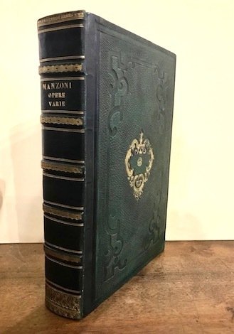 4to (cm. 27), 864 pp. con 10 xilografie a piena pagina incise da Ratti su disegni di Roberto Focosi, tranne l’ultima che è Fiorentini, per le Tragedie; 9 grandi testatine e altrettanti capilettera figurati (incisi da Ratti e Salvioni su disegni di P. Riccardi e S. Mazza) per le Poesie. Bella legatura coeva in mz. pelle con piccoli nervi, fregi e titolo in oro al ds. (rinforzi interni alle cerniere). Piatti in percallina verde con cornici a secco e impressioni dorate. Tagli oro. Carte di guardia marmorizzate. Cofanetto in cartonato rigido moderno. Esemplare in ottimo stato di conservazione, praticamente privo delle abituali fioriture. Prima edizione. Parenti, ‘Rarità bibliografiche dell’800’, I, pp. 239-246.