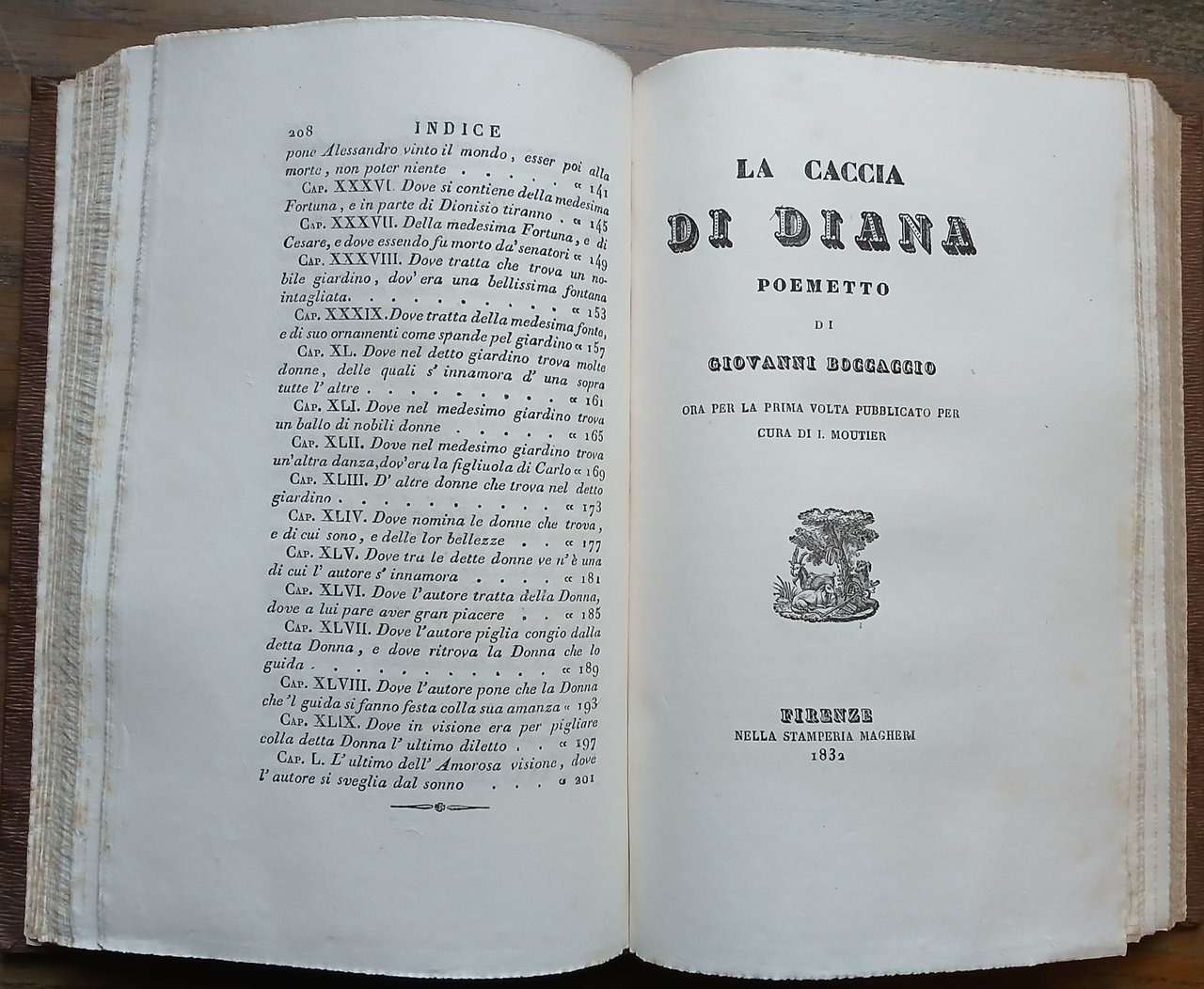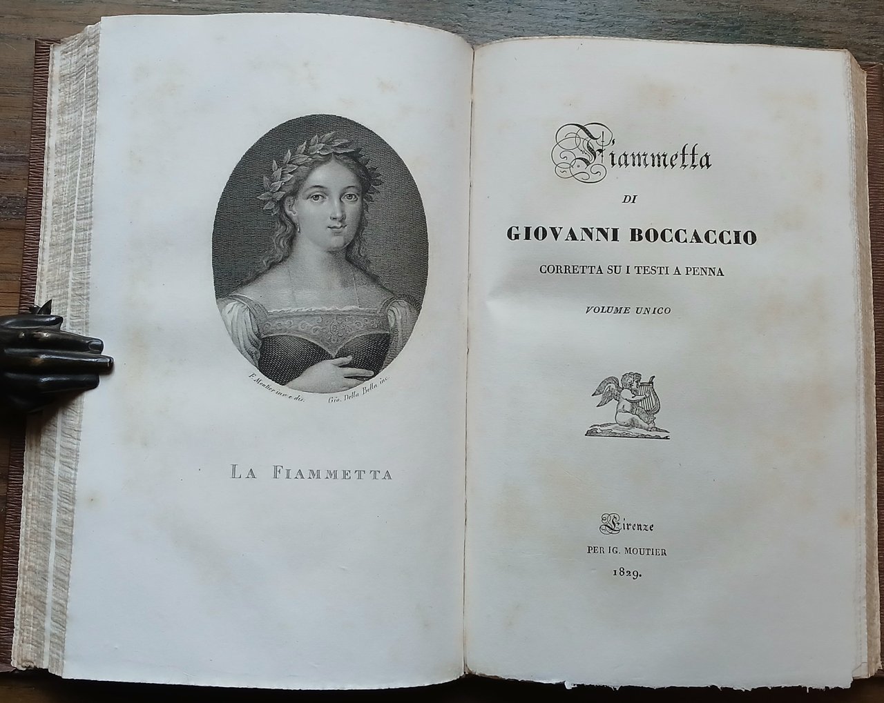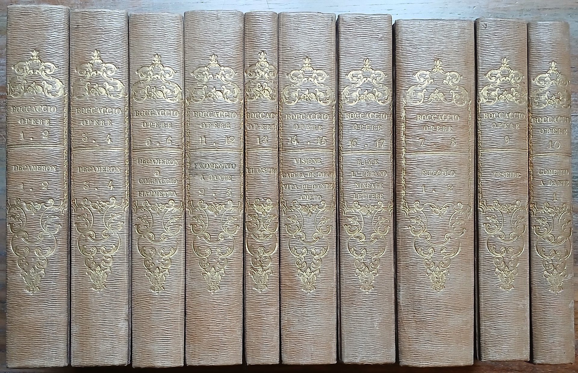 Volumi XVII riuniti in 10 tomi in 8°, legatura coeva in piena percallina con titoli e fregi in oro al dorso ed impressioni a secco ai piatti, pp. LII,275,(1),260 ; 280,XI,(1),223,(1) ; 260,XI,(1),210 con un ritratto di Fiammetta inciso in antiporta ; VIII,355,(1),378 ; XIII,(1),432,(2) ; XVI,355,(1) ; 302,(8),258 ; VIII,258 ; VII,(1),208,60,96,201,(1) ; 194,65,(1),164,146. Voll. I-V : "Il Decameron corretto ed illustrato" , "Il Corbaccio". Vol. VI : "Fiammetta". Voll. VII-VIII : " Il Filocopo (o Filocolo)". Vol. IX : "Teseide". Voll. X-XI-XII : "Il Commento sopra la Commedia di Dante Alighieri". Vol XIII : "Il Filostrato". Voll. XIV-XV : "Amorosa Visione" , "La Caccia di Diana" (qui pubblicato a stampa per la prima volta), "La Vita di Dante Alighieri", "L'Ameto". Voll. XVI-XVII : "Rime", "L'Urbano", "Ninfale Fiesolano", "Lettere volgari", "Testamento di M. Gio. Boccaccio". Opera in ottimo stato di conservazione, delle due tavole incise previste non è presente il ritratto del Boccaccio.
