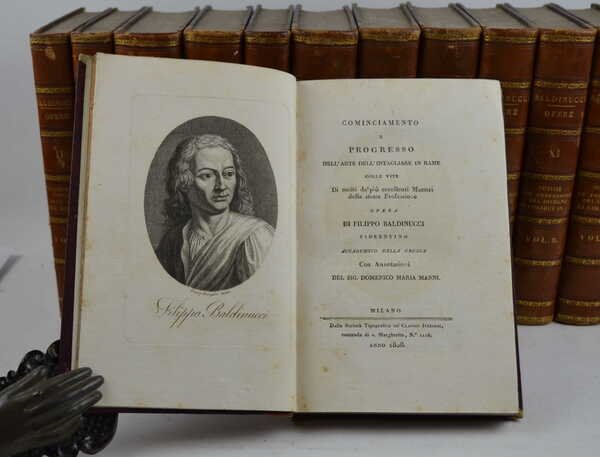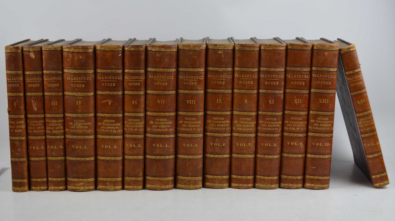 Quattordici volumi di cm. 20,5, pp. 3.500 ca. complessive. Ritratto inciso dell'autore all'antiporta del primo volume. Solida ed elegante legatura coeva in mezza pelle, dorsi lisci con titoli e fregi in oro e piatti marmorizzati. Bell'esemplare, in ottimo stato di conservazione. Ex libris nobiliare inciso in rame. La raccolta è così suddivisa: Volume I.: Cominciamento e progresso dell'arte di intagliare in rame colle vite di molti de' piu' eccellenti maestri. Volume II-III: Vocabolario dell'arte del Disegno. Volume IV-XIV: Notizie de' professori del Disegno da Cimabue in qua. Ottima e stimata edizione che contiene delle aggiunte rispetto alle precedenti impressioni.