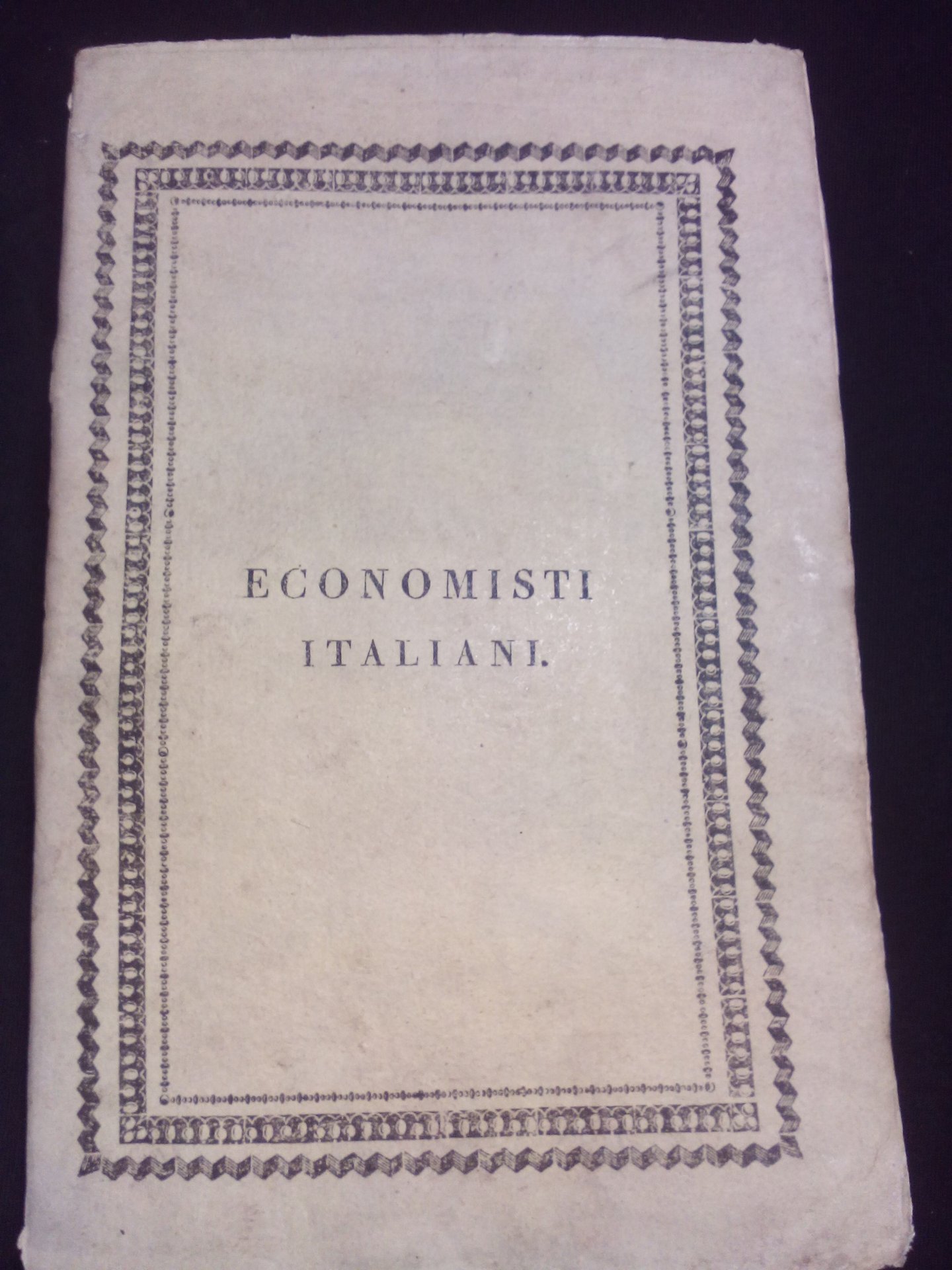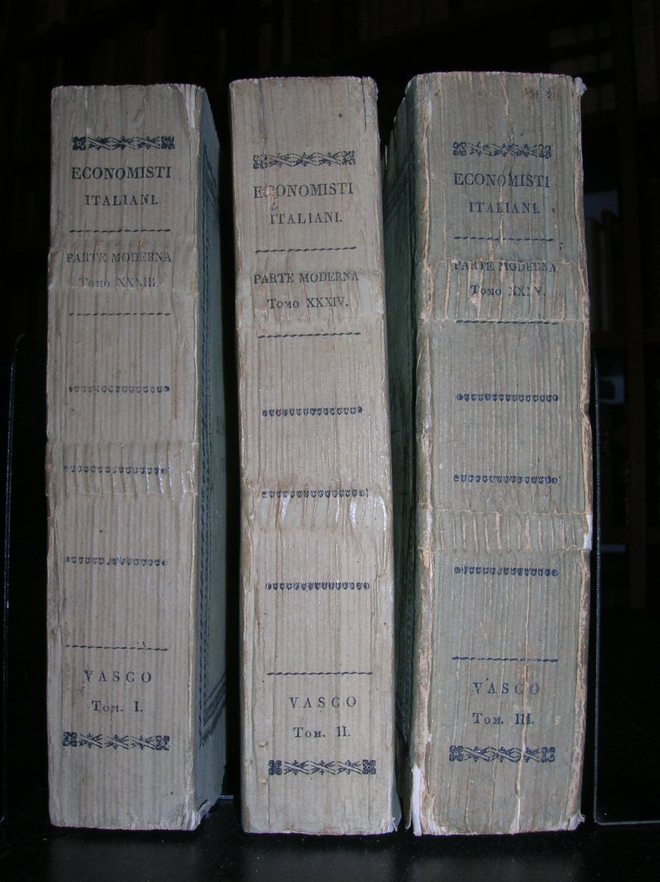 Sono i voll. XXXIII, XXXIV e XXXV della raccolta "Economisti classici italiani", parte moderna. 3 voll. in 8°, p. VIII,406(2); 423(1); 472(4). 7 tabelle statistiche di cui 3 f.t. più volte ripiegate alla fine del terzo vol. Intonsi. Gore al margine superiore delle prime carte e segni di tarlo in sei carte del terzo vol. Brossura originale.
