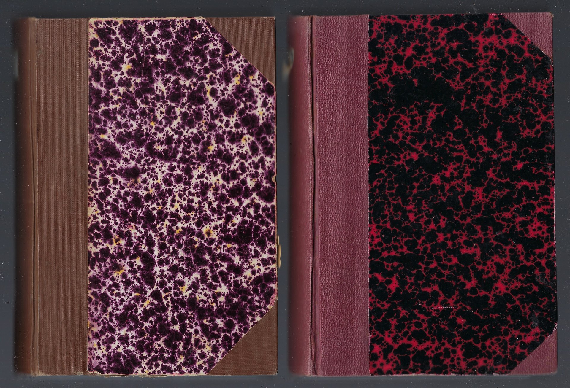 Legature in mezzo zigrino con angoli, piatti rivestiti in carta marmorizzata e con tassello cartaceo con titolo al dorso liscio. Presentano piccoli segni d'usura ed abrasioni (perlopiù agli angoli ed ai margini).