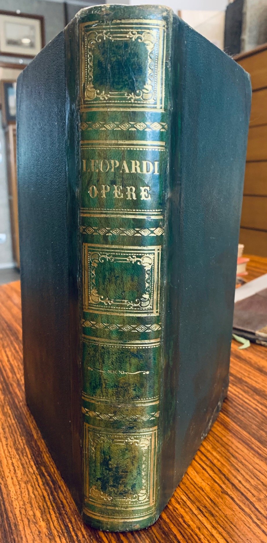 >in-4 (243x150), pp. X, (2), 429;260 672, in antiporta il ritratto di Leopardi. Legatura mezza pelle verde, titolo oro e fregi al dorso. Esemplare discreto con qualche leggera macchietta rossa. Accuratissima e fondamentale edizione critica di tutte le opere del grande recanatese.