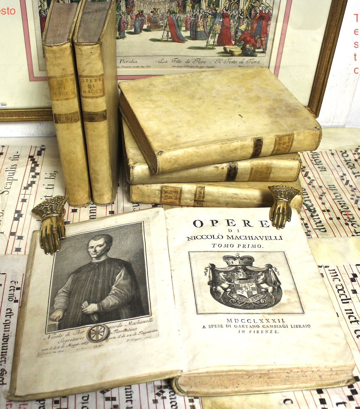 6 voll. In 4° (mm 266x192); pagg. C, 451; (4), 420; (4), 490; (4), 392; (4), 475; XII, (2), 532 per 2884 pagg. complessive con un ritratto dell'aut. inciso da F. Gregori da un dipinto di Santi di Tito; elegante vignetta di gusto araldico ripetuta ai frontespizi e due tavole ripieg. f.t. (una nel tomo II ed una nel IV).Bella legatura in pergamena rigida coeva, tagli a spruzzo. Dorso con doppio tassello, su cui sono impressi in oro, il nome, l'opera ed il num. del tomo. Una delle migliori edizioni dell'Opera omnia del Machiavelli, con alcuni scritti inediti, molto apprezzata per la veste tipografica di alta qualità.Ottimo esemplare su carta vergellata; minime tracce d'uso internamente per lievi aloni al III e V vol., e più accentuato al VI. Brunet III, 1275; Gamba 628: "Edizione la più copiosa di quante si fossero antecedentemente eseguite…"; Bertelli-Innocenti, pag. 175.