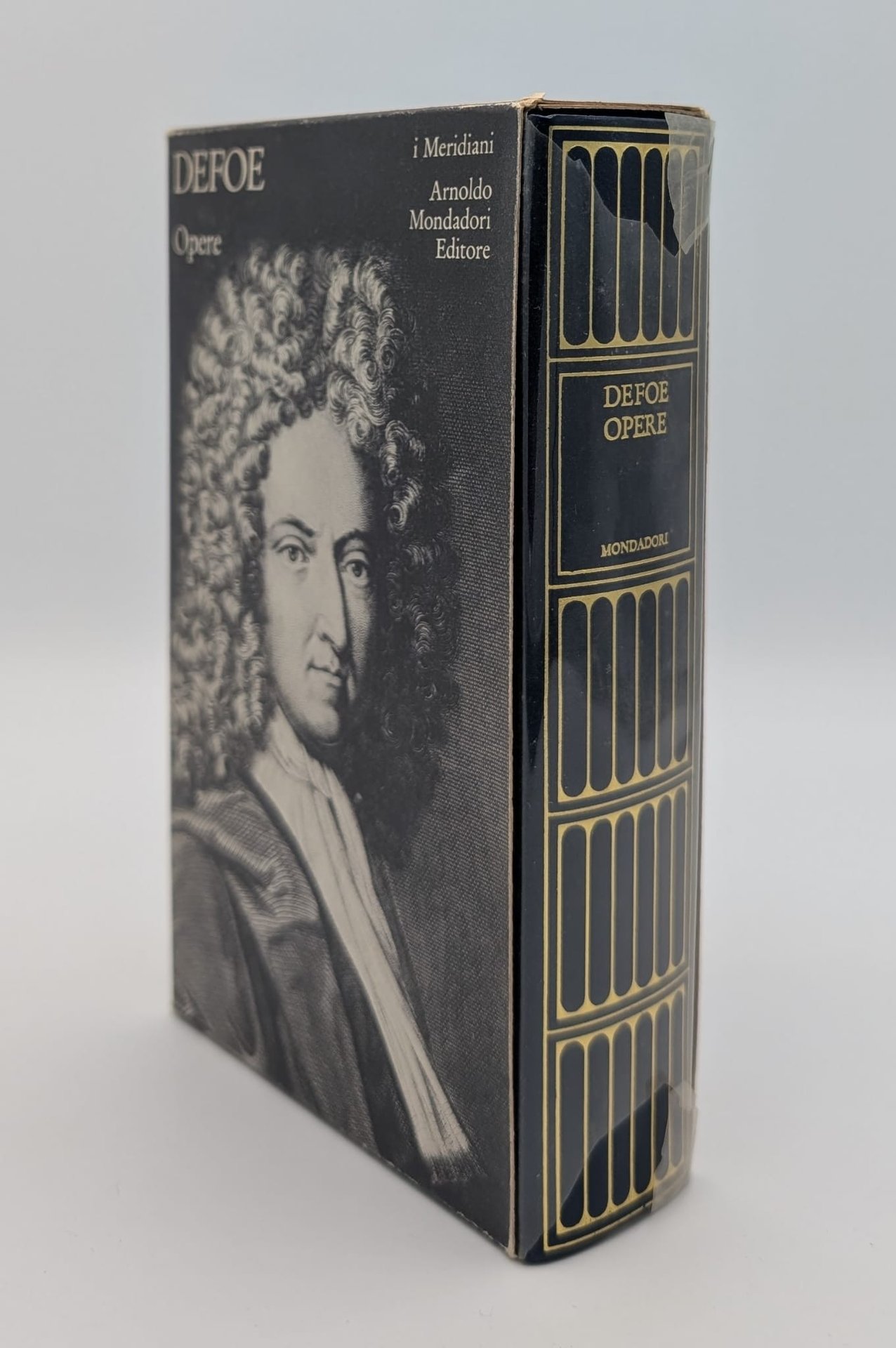 Defoe Daniel: Opere. Arnoldo Mondadori Editore, 1980In-16 (Cm 17 x 11), pp. XLV-1068 legatura editoriale con acetato protettivo, cofanetto editoriale illustrato. A cura di Anna Banti e Giuseppe Gaetano Castorina. Introduzione di Anna Banti. Prima edizione I Meridiani maggio 1980. Ex libris alla sguardia posteriore. Piccolo strappetto e mancanza all'acetato. OTTIMO