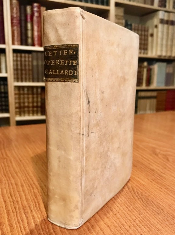 2 opere in 1 volume in-8° (cm. 16,7); legatura coeva in p. pergamena rigida con titolo in oro su tassello al dorso, tagli spruzzati; pp. XXXVI 199 [1b], XXXIX [1] 287 [3] in ottimo stato, solo un leggerissimo alone marginale per altro a poche carte. Due raccolte, entrambe in edizione originale, che contengono scritti del canonico Gagliardi sul vernacolo bresciano, la fabbrica del duomo, il viaggiare, oppure traduzioni, saggi eruditi. Ottimo esemplare. (SP2)