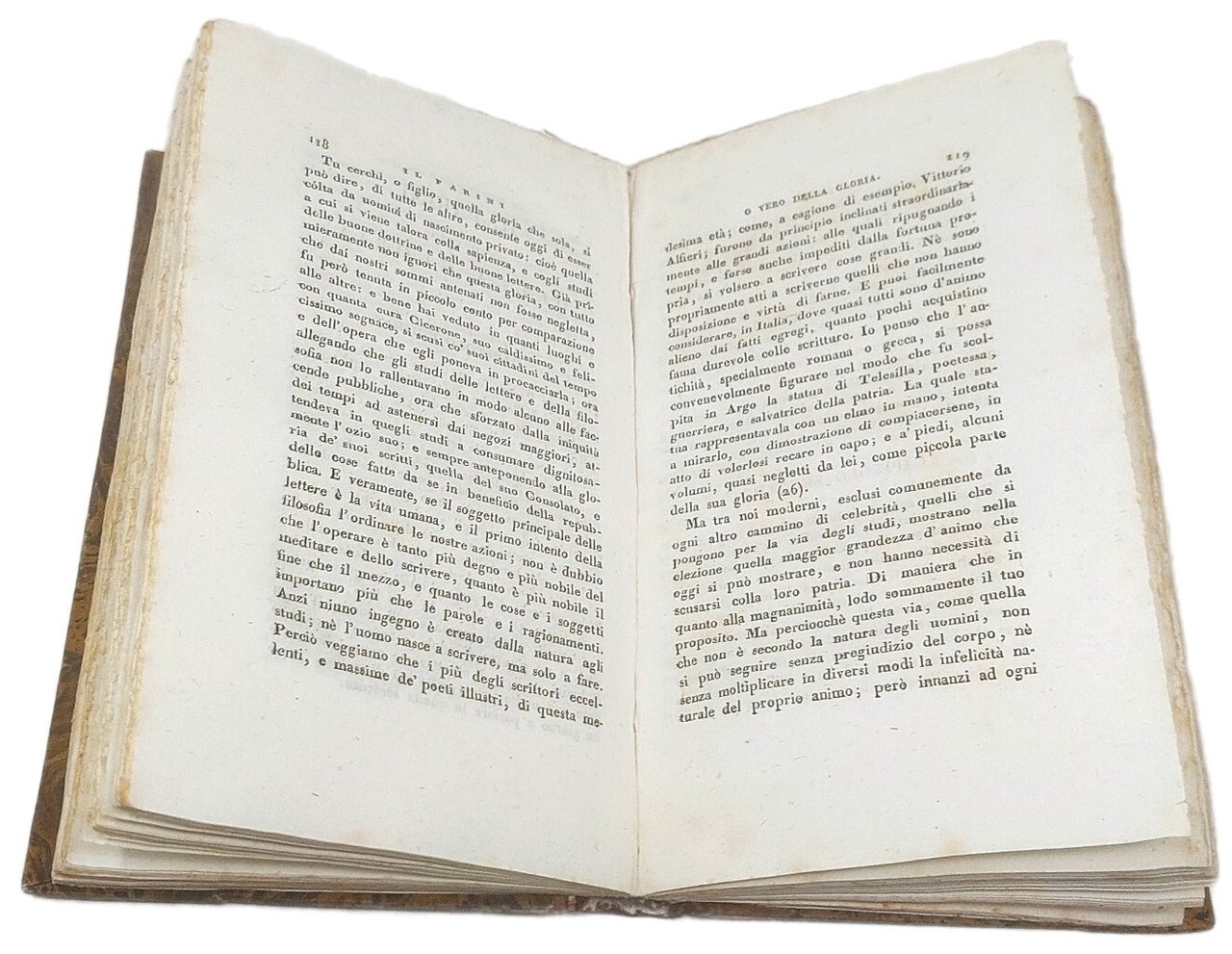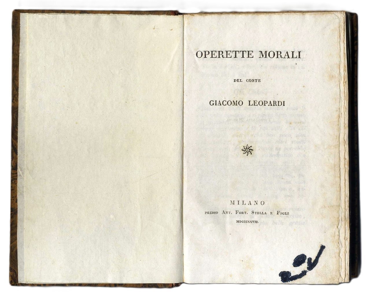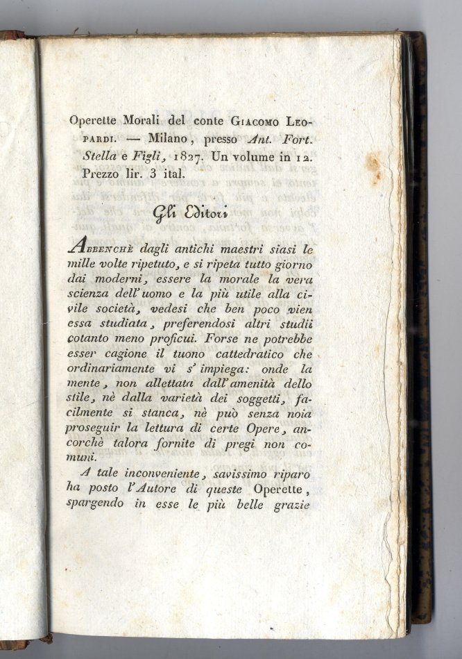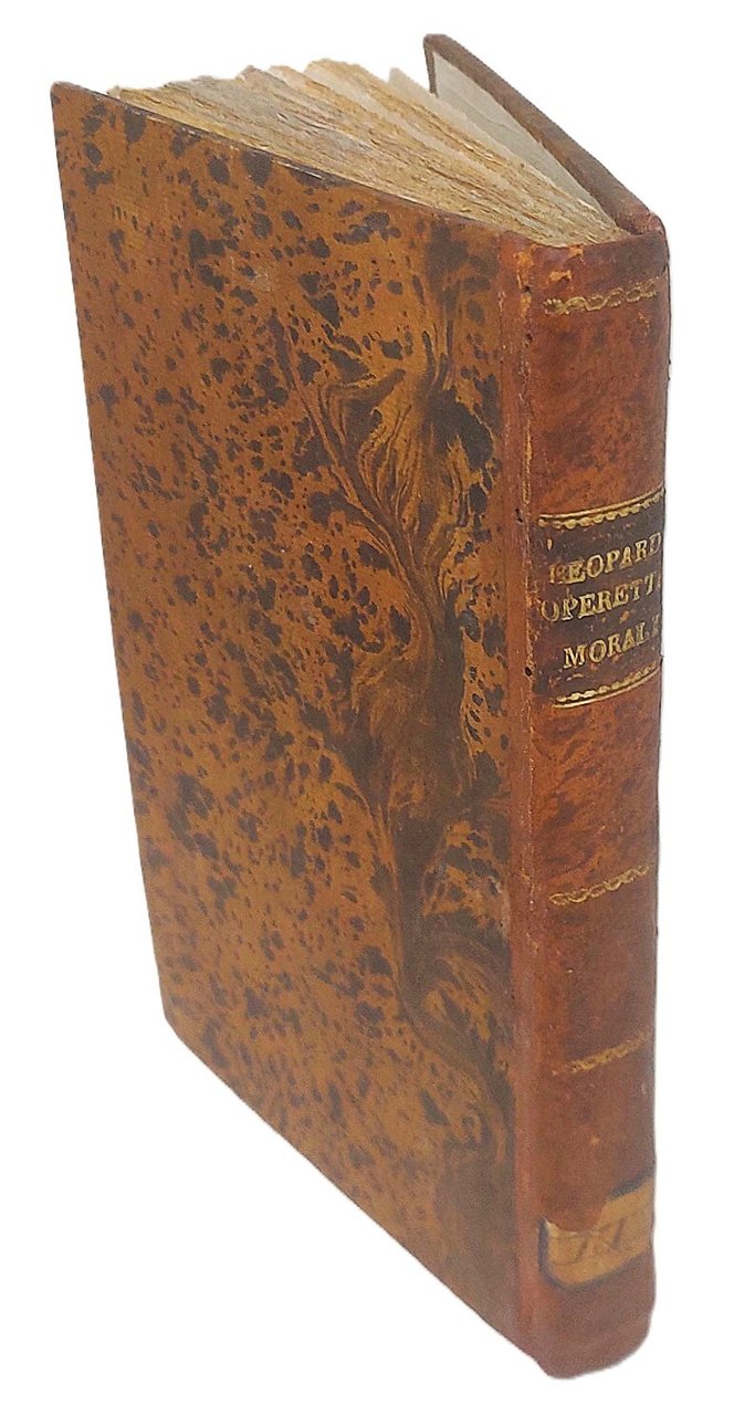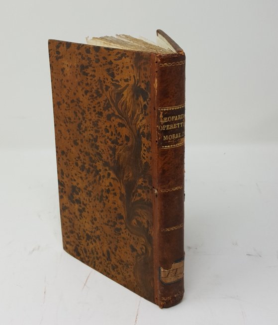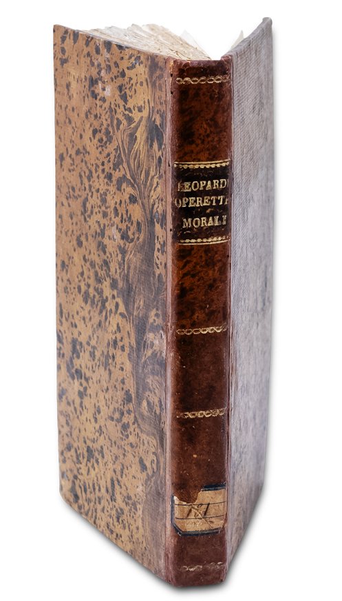 Edizione originale di queste 20 "poesie in prosa'', come vennero definiti questi componimenti che offrono, in elaborati dialoghi, le descrizioni dei fatti mitologici cari al Leopardi. Solo tre Dialoghi erano già apparsi l'anno precedente nel fasc. LXI dell'Antologia (i Dialoghi di Timandro ed Eleandro; di Cristoforo Colombo e Pietro Gutierrez; di T. Tasso e del suo genio familiare). Fu messa all'Indice dei Libri Proibiti con la clausola ''donec emendatum''. Lo stesso Stella fu molto combattuto riguardo alla pubblicazione di questa raccolta. Una seconda edizione uscì nel 1834 con l'aggiunta di due operette. Bell'esemplare a pieni margini con barbe (lievi fioriture, scritta coperta da inchiostro nell'angolo inferiore bianco del titolo) con le prime 20 "Operette Morali" (benché siano erroneamente indicate 21 da varie descrizioni di librerie). Questa copia è da considerarsi un "unicum" per l'aggiunta delle 4 pagine di avviso pubblicitario, mai riscontrato in altri esemplari. Mazzatinti Menghini 667. Fondo Leopardiano Milano, n.92.