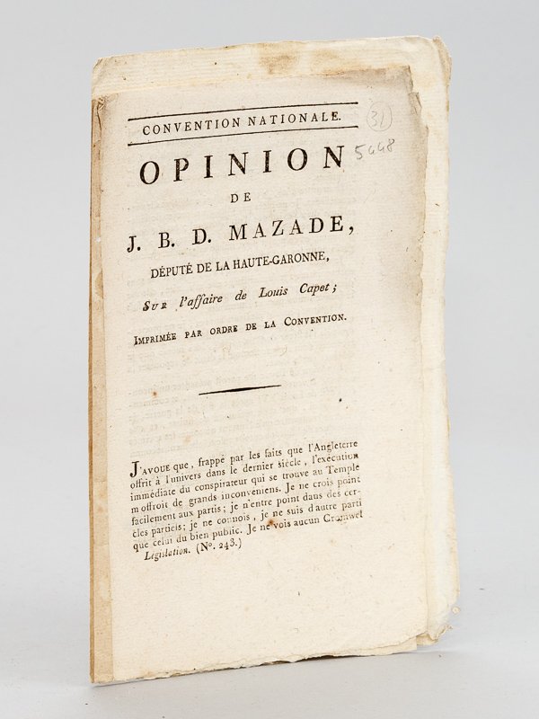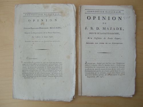 Opinion de J. B. D. Mazade, Député de la Haute-Garonne, sur l'affaire de Louis Capet. [ Suivi de : ] Opinion de Julien-Bernard-Dorothée Mazade, Député du Département de la Haute-Garonne, sur l'affaire de Louis Capet