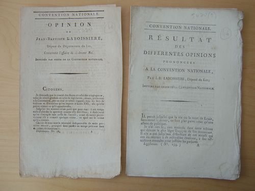 Imprimées par ordre de la Convention Nationale, 2 brochure in-8 en feuilles, De l'Imprimerie Nationale, Paris, s.d. 2 et 7 pp. Bon ensemble réunissant les deux brochures dans lesquelles le conventionnel Laboissière expose ses opinion sur le procès de Louis XVI. Martin & Walter, 17863 et 17865