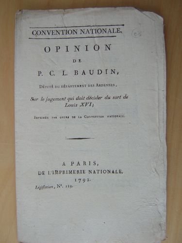 Imprimé par ordre de la Convention Nationale, 1 brochure in-8 en feuilles, De l'Imprimerie Nationale, 1792, 7 pp. Etat très satisfaisant. Manque à Martin & Walter. Lors du procès du roi Louis XVI, Baudin vota pour l'appel au peuple, et pour la réclusion suivie du bannissement.