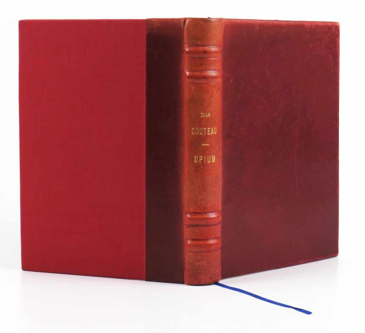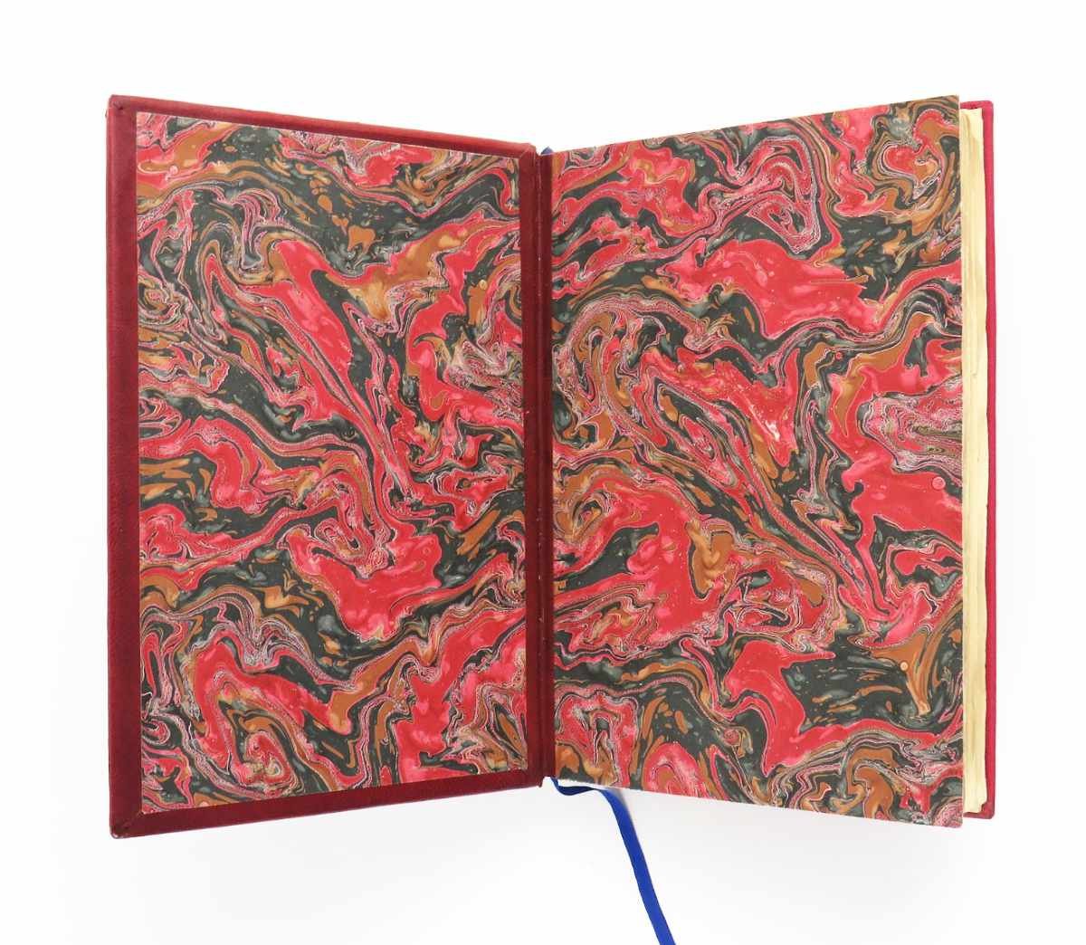• legatura di gusto déco in pieno marocchino con piatto posteriore in mezza tela rossa; due nervi alla testa e due al piede del dorso; titolo e autore in oro al dorso; conserva i piatti della brossura originale in carta avorio stampata in nero;
